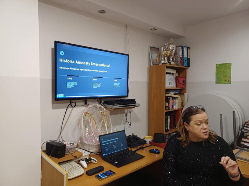 W dniu 4 grudnia 2025 r. wychowawczynie p. Barbara Zaręba-Teterycz i p. Agnieszka Piróg poprowadziły pogadankę na temat Amnesty International, która jest organizacją międzynarodową działającą na rzecz ochrony praw człowieka. Organizacja powstała w 1961 r. w Londynie. Działa poprzez badanie, dokumentowanie i nagłaśnianie naruszeń praw człowieka, a także prowadzenie kampanii informacyjnych i edukacyjnych, mających na celu wywieranie presji na rządy i instytucje oraz pomoc ofiarom. Prowadziła misje i kampanie w obronie praw człowieka m. in. w: Pakistanie, Tanzanii, Afganistanie, Chile, Jugosławii, Chinach, Arabii Saudyjskiej. W 1983 r. dzięki organizacji publikowano specjalny raport na temat zabójstw politycznych popełnianych na zlecenie rządów. Od 1981 r. prowadzone są kampanie przeciw karze śmierci.