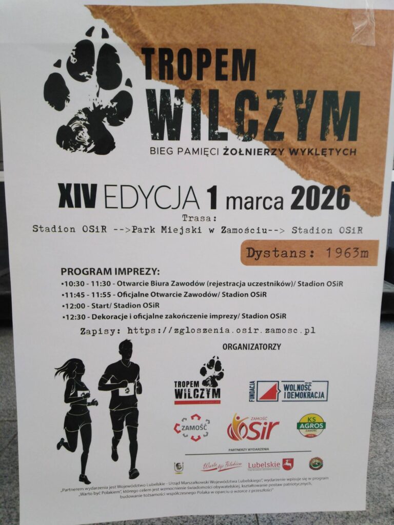 Podczas XIV edycji zamojskiego Biegu Tropem Wilczym, który odbył się 1 marca 2026 r. w Narodowy Dzień Pamięci Żołnierzy Wyklętych, młodzież Zespołu Szkół Ponadpodstawowych Nr 5 im. Józefa Piłsudskiego w Zamościu z klas mundurowych: klasy 2 opw – oddziału przygotowania wojskowego, klasy 3 LP i 4 LP – klasy policyjnej oraz klasy 4 TM – technikum mechanizacji rolnictwa i agrotroniki z zaangażowaniem włączyła się w organizację wydarzenia. Uczniowie pomagali w wydawaniu pakietów startowych, wręczali medale uczestnikom oraz czuwali nad bezpieczeństwem na trasie biegu, wspierając organizatorów na każdym etapie imprezy.