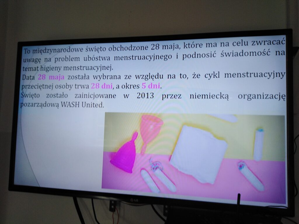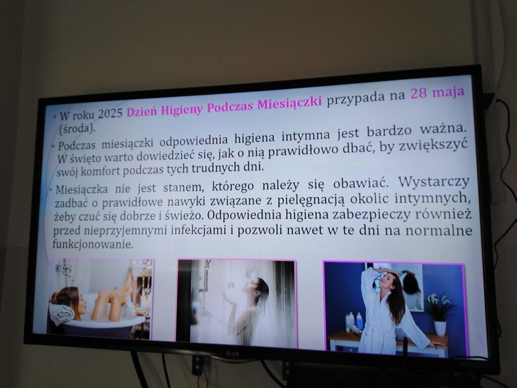 28 maja 2025 r. w naszym internacie w ramach cyklu zajęć „Środa z profilaktyką” odbyła się prelekcja, która porusza temat często pomijany, ale niezwykle ważny – higiena podczas miesiączki. Spotkanie zostało zorganizowane z okazji Międzynarodowego Dnia Higieny Menstruacyjnej, a jego celem było nie tylko przekazanie wiedzy, ale też przełamanie tabu i stworzenie bezpiecznej przestrzeni do rozmowy.
