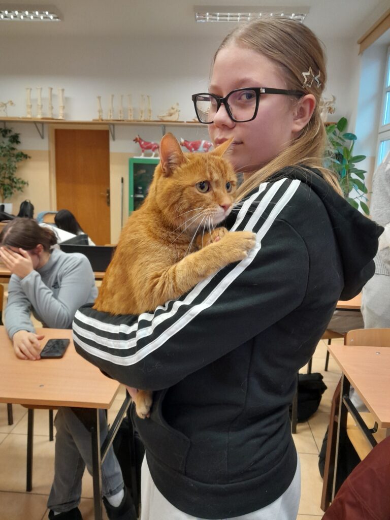 W spotkaniu uczestniczyła również szkolna pani psycholog, Agnieszka Skotarska, która aktywnie poszukuje kota do pracy terapeutycznej z dziećmi z zaburzeniami rozwojowymi. Warto wiedzieć, że obecność kota podczas terapii może obniżać poziom stresu, wspierać rozwój emocjonalny, poprawiać koncentrację oraz ułatwiać nawiązywanie relacji. Ciekawostką jest fakt, że mruczenie kota ma częstotliwość sprzyjającą relaksacji i regeneracji organizmu, co czyni go wyjątkowym „współterapeutą”.