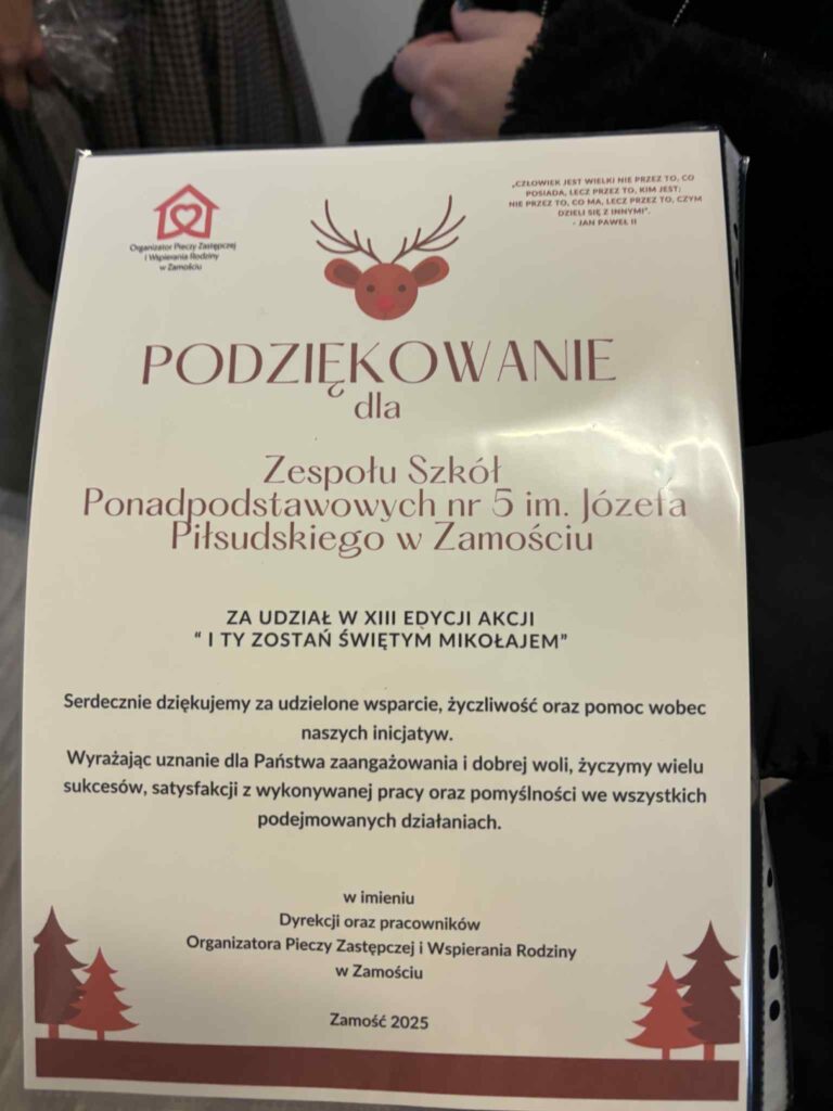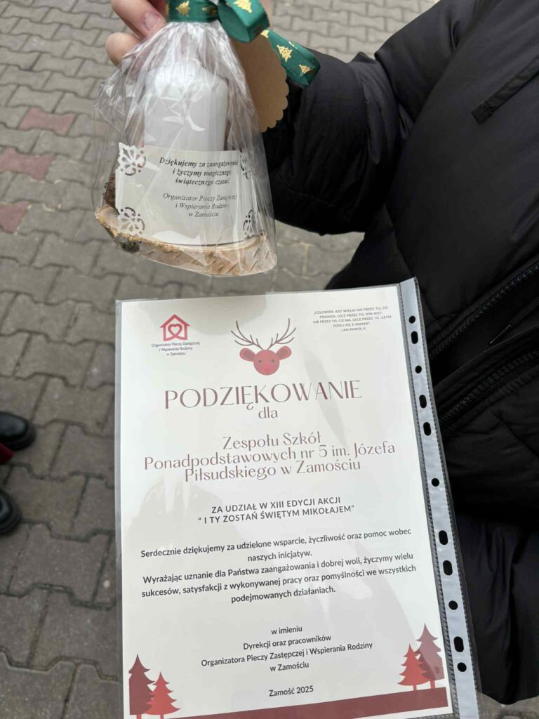 W internacie zakończyliśmy z sukcesem akcję mikołajkową „I Ty Możesz Zostać Świętym Mikołajem”. Uczniowie oraz wychowawcy połączyli siły przygotowując paczki dla podopiecznych Organizatora Pieczy Zastępczej i Wspierania Rodziny w Zamościu.