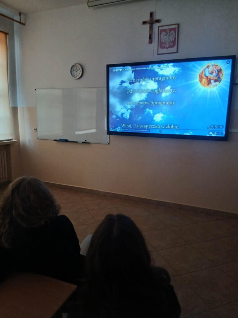 Pod koniec zajęć był czas na wspólne kolędowanie. Lekcja przeprowadzona w taki sposób sprzyjała przyswajaniu informacji w przyjemny sposób, budując pozytywne nastawienie do nauki.