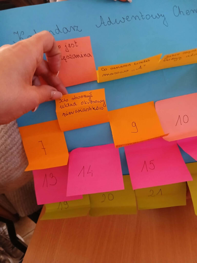Uczniowie własnoręcznie wykonali kalendarze adwentowe, w okienkach których ukryli pytania dotyczące omówionych na lekcjach chemii zagadnień.