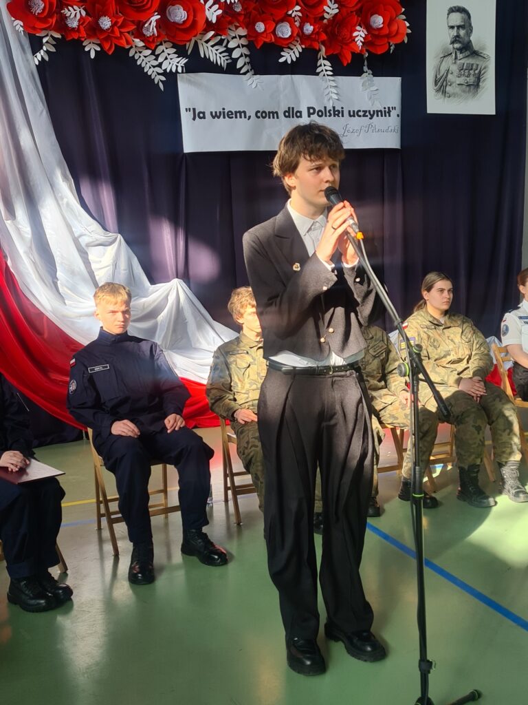 Recytatorzy przypomnieli historię Polski, podkreślili znaczącą rolę Józefa Piłsudskiego w życiu Polaków (w tym patrona szkoły), wskazali rangę patriotyzmu, a przede wszystkim zwrócili uwagę na znaczenie słowa „ojczyzna” w życiu każdego Polaka oraz dokonania polskich żołnierzy (Gdyby nie oni, nie byłbyś tu,/ Nie znałbyś świata i ciebie świat./ Nie przeżyłbyś stu kolorowych dni,/ Zwyczajnych dni, słonecznych dat./ Nie wiedziałbyś, co znaczy żyć,/ Kochać, budować, marzyć, śnić …).
