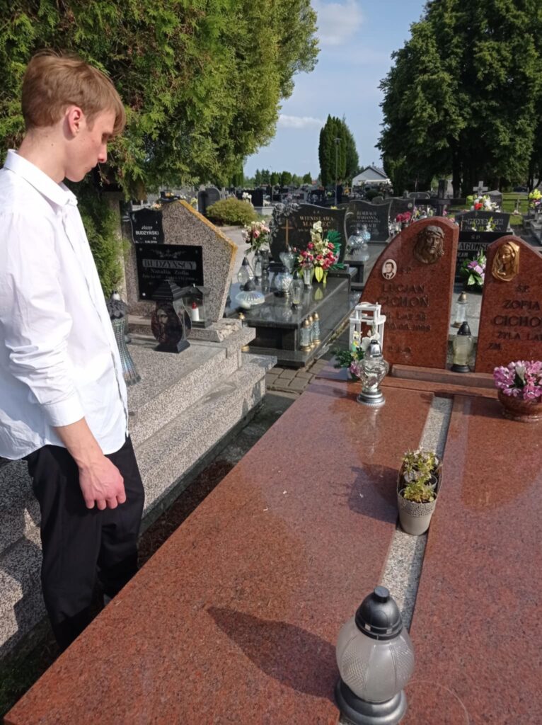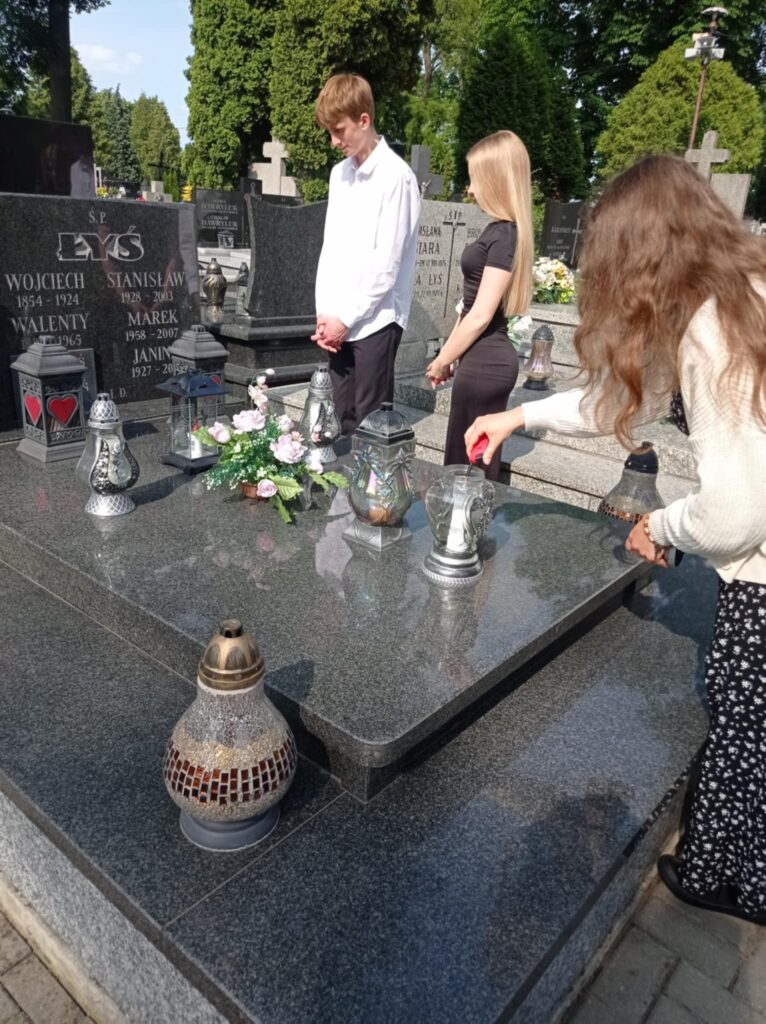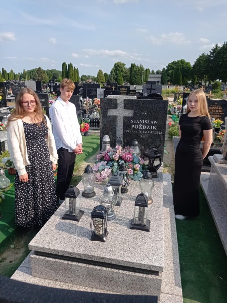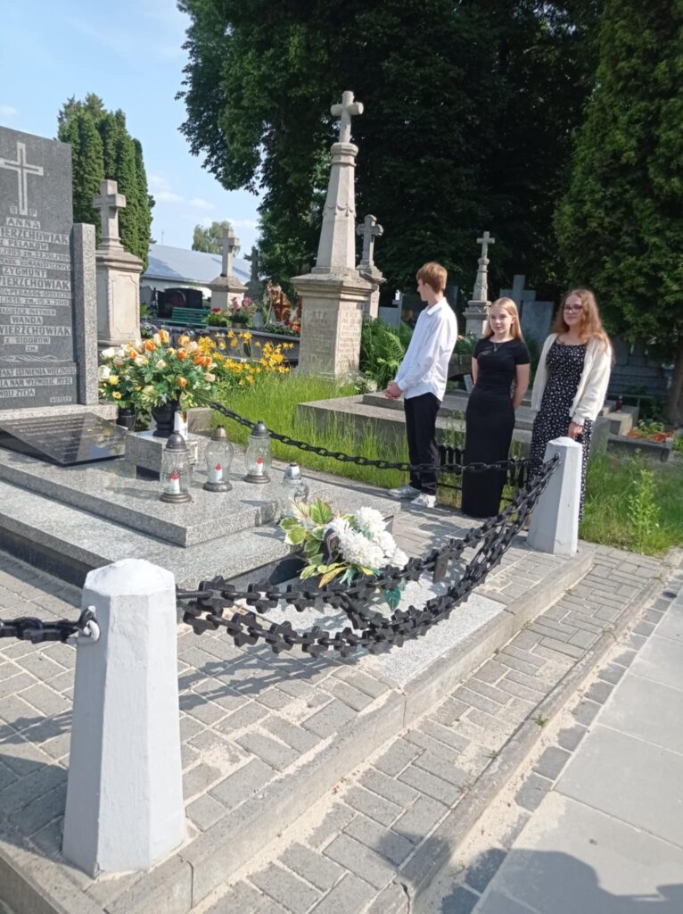 W dniu 10 czerwca 2025 r. delegacja wychowanków Internatu przy Zespole Szkół Ponadpodstawowych Nr 5 im. Józefa Piłsudskiego w Zamościu wraz z wychowawczyniami p. Moniką Poździk i p. Zuzanną Majdan, kontynuując rozpoczętą w sobotę „Drogę wspomnień”, udała się na Cmentarz Parafialny przy ul. Peowiaków oraz Cmentarz Komunalny na Karolówce, aby w roku jubileuszowym szkoły uczcić pamięć o zmarłych dyrektorach, nauczycielach, wychowawcy internatu oraz pracownikach szkoły. Podobnie jak w Jaśle na grobie pierwszego dyrektora szkoły Stefana Bauera, tak i tu w Zamościu zapalili znicze pamięci i minutą ciszy oraz modlitwą uczcili pamięć o zmarłych.
