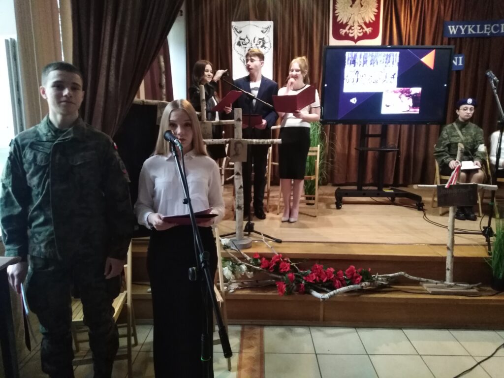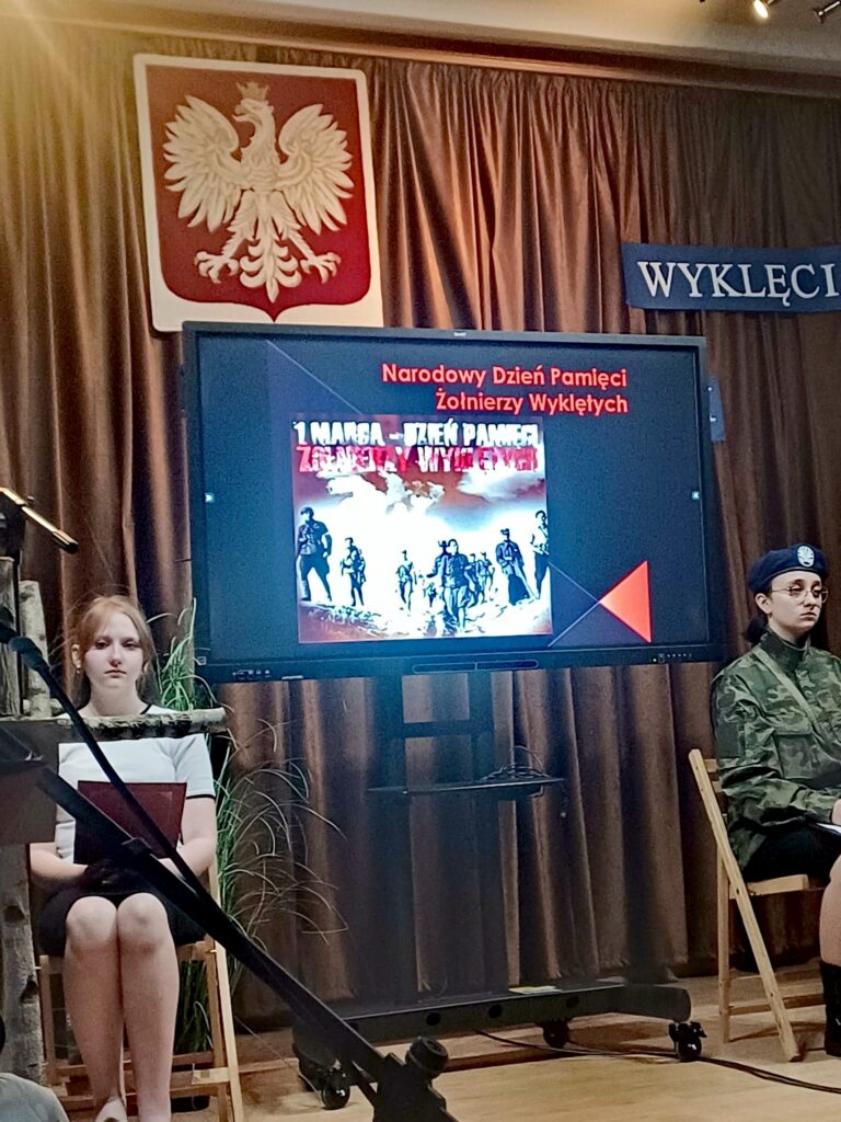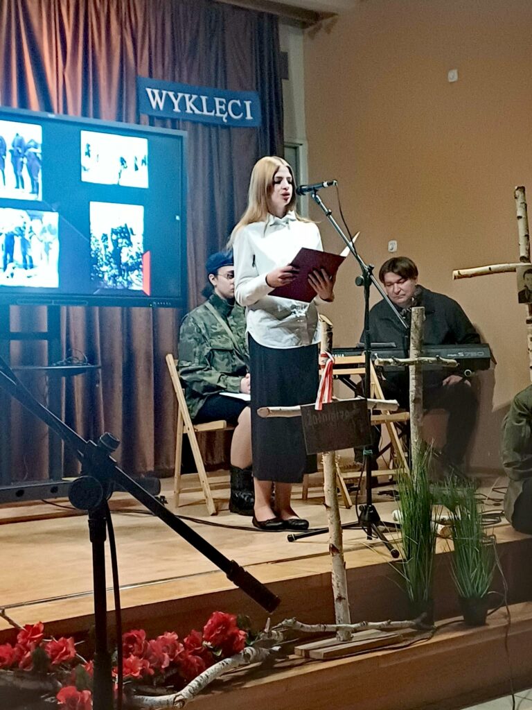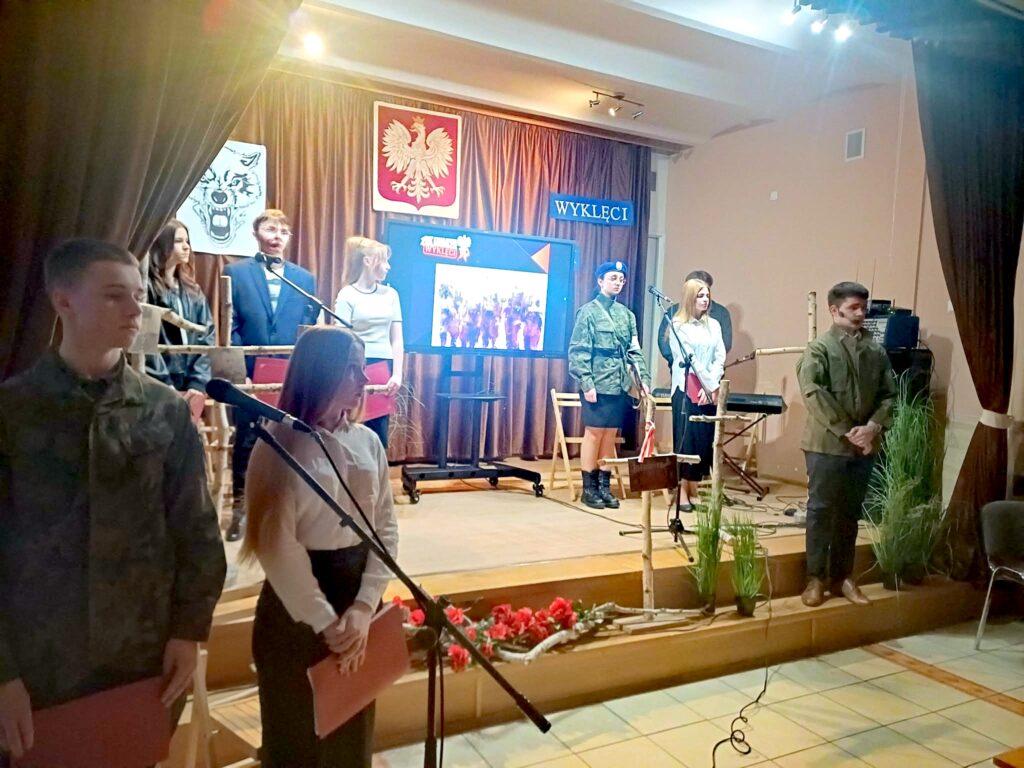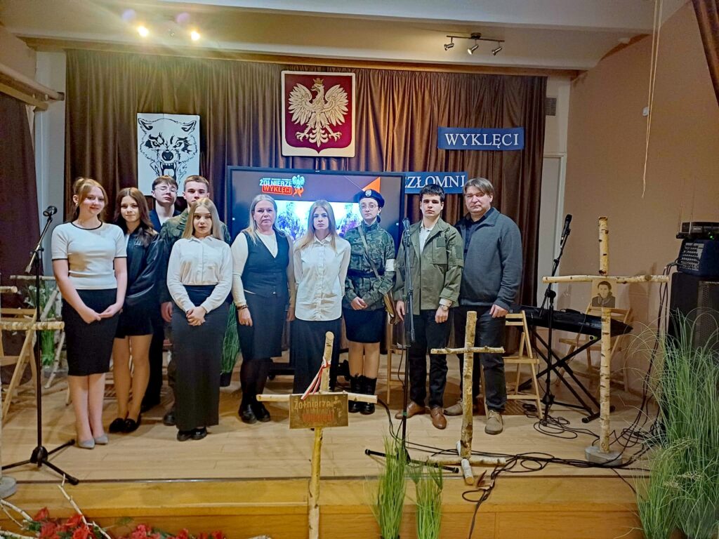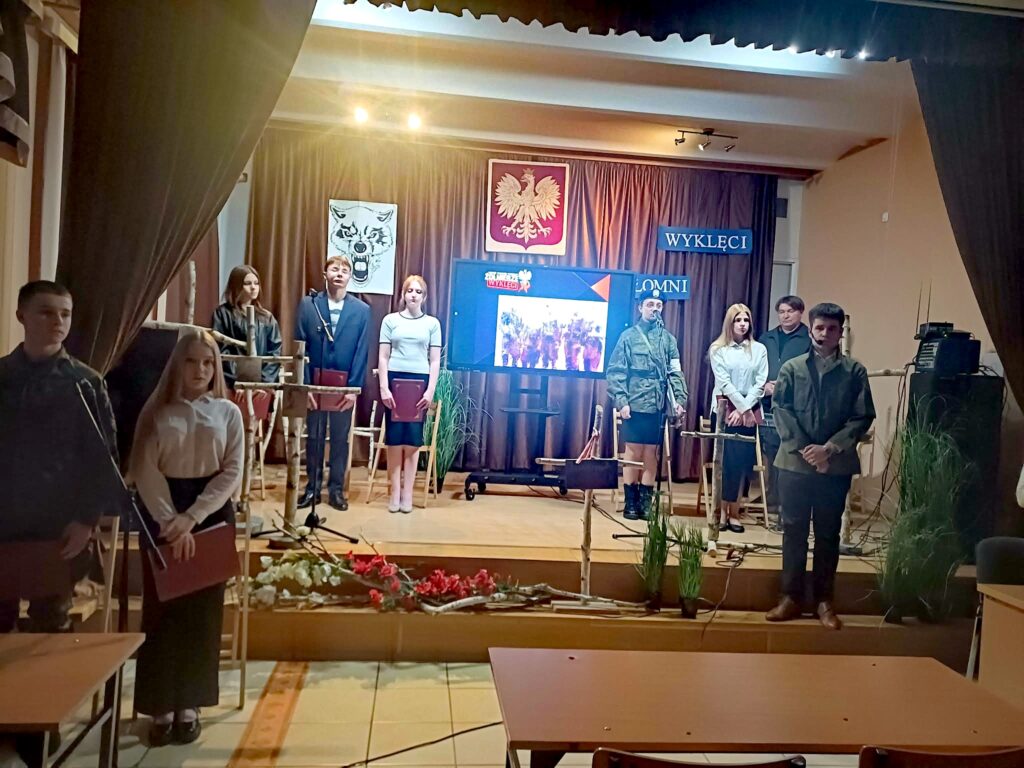 10 marca 2026 r. w szkolnej świetlicy odbyła się nietypowa lekcja historii. Zespół artystyczny z internatu pod kierunkiem p. Moniki Poździk (scenariusz, dekoracja, prezentacja multimedialna) oraz p. Mariusza Czochry (muzyka), zaprezentował montaż słowno-muzyczny poświęcony Żołnierzom Wyklętym w ramach obchodzonego 1 marca Narodowego Dnia Pamięci Żołnierzy Wyklętych.