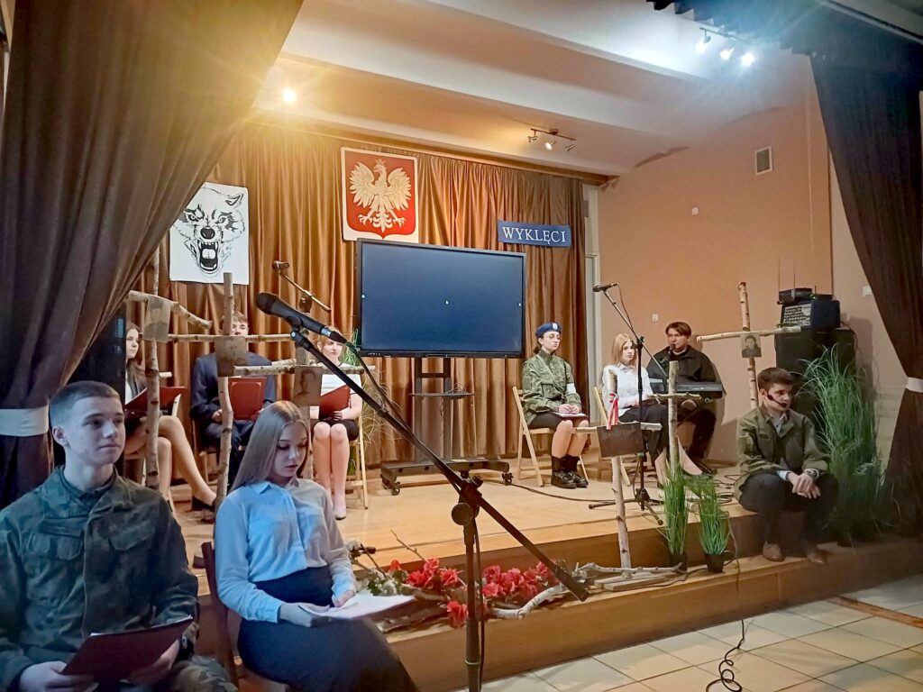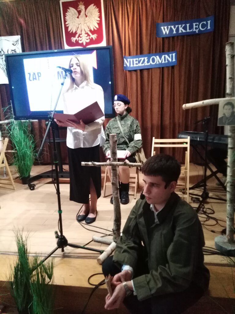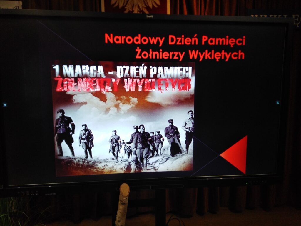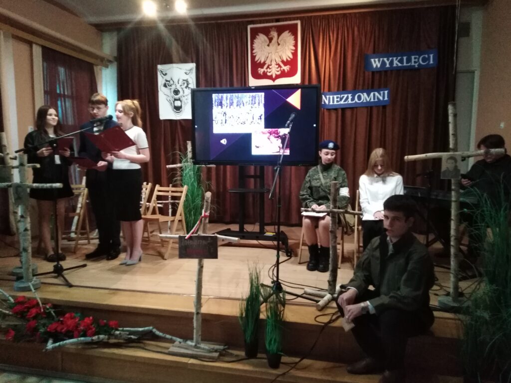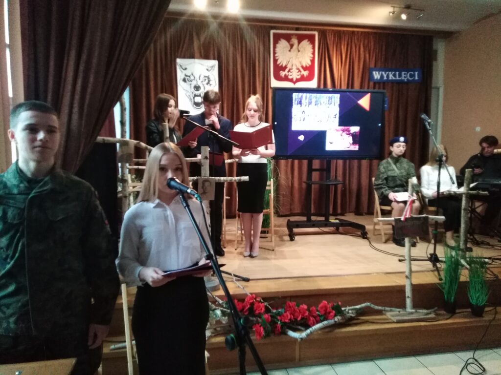 10 marca 2026 r. w szkolnej świetlicy odbyła się nietypowa lekcja historii. Zespół artystyczny z internatu pod kierunkiem p. Moniki Poździk (scenariusz, dekoracja, prezentacja multimedialna) oraz p. Mariusza Czochry (muzyka), zaprezentował montaż słowno-muzyczny poświęcony Żołnierzom Wyklętym w ramach obchodzonego 1 marca Narodowego Dnia Pamięci Żołnierzy Wyklętych.