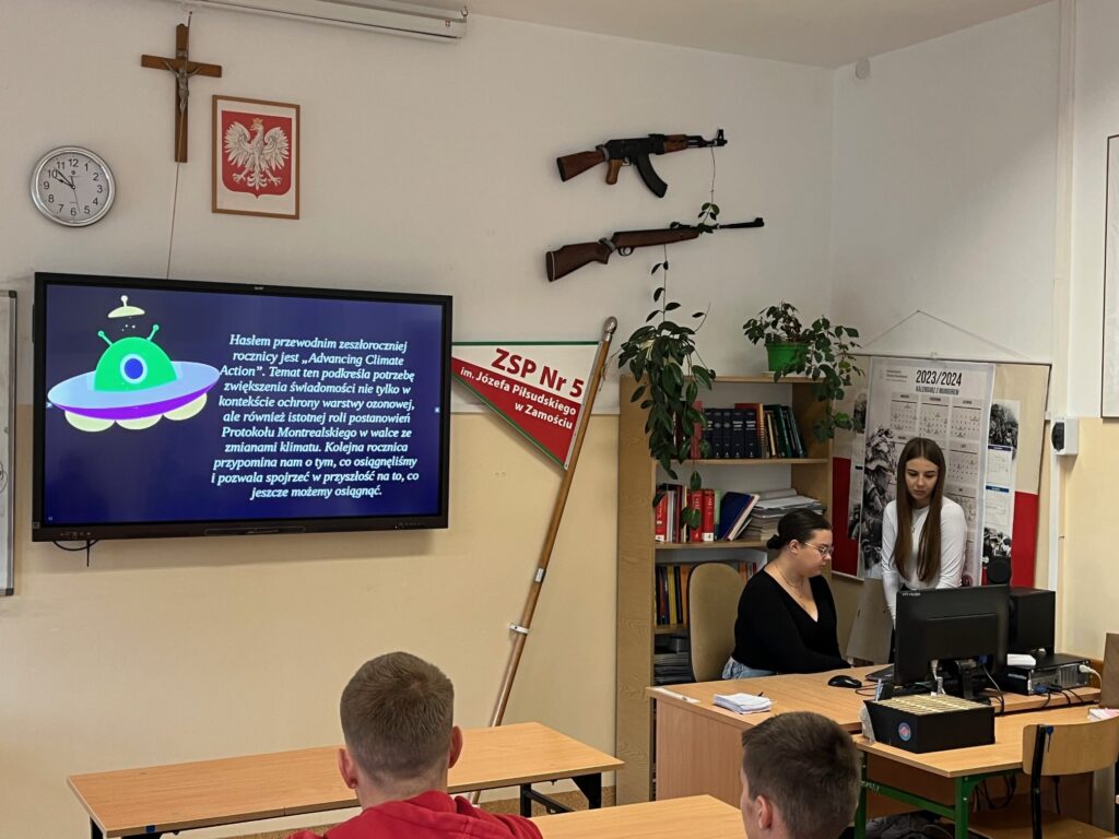 Uczniowie uczestniczyli w specjalnie przygotowanej przez uczennice klasy 4TZ prezentacji multimedialnej, podczas której dowiedzieli się, czym jest warstwa ozonowa, jakie pełni funkcje, jakie zagrożenia jej zagrażają oraz co każdy z nas może zrobić, aby ją chronić.