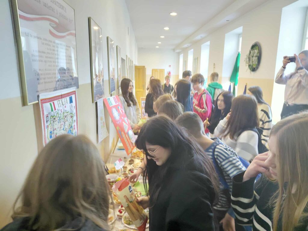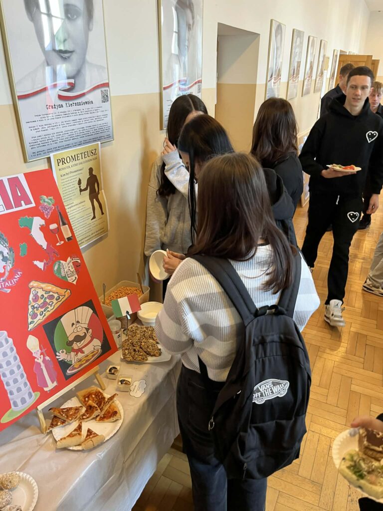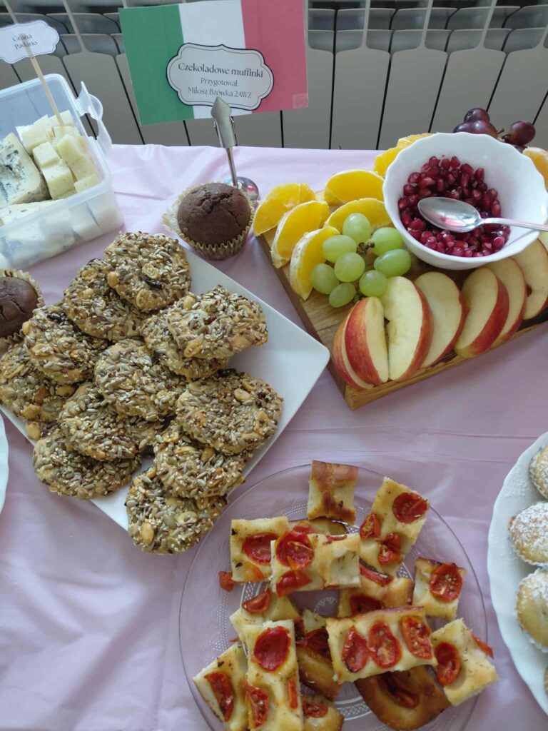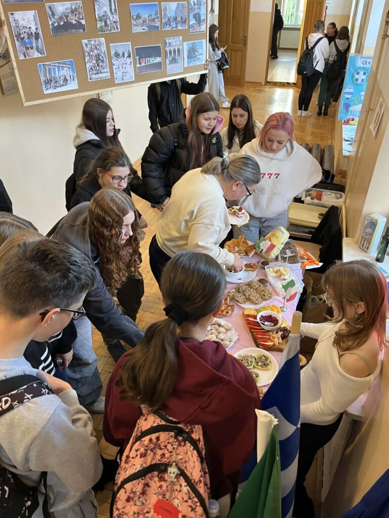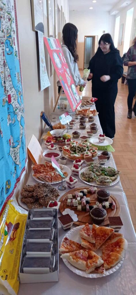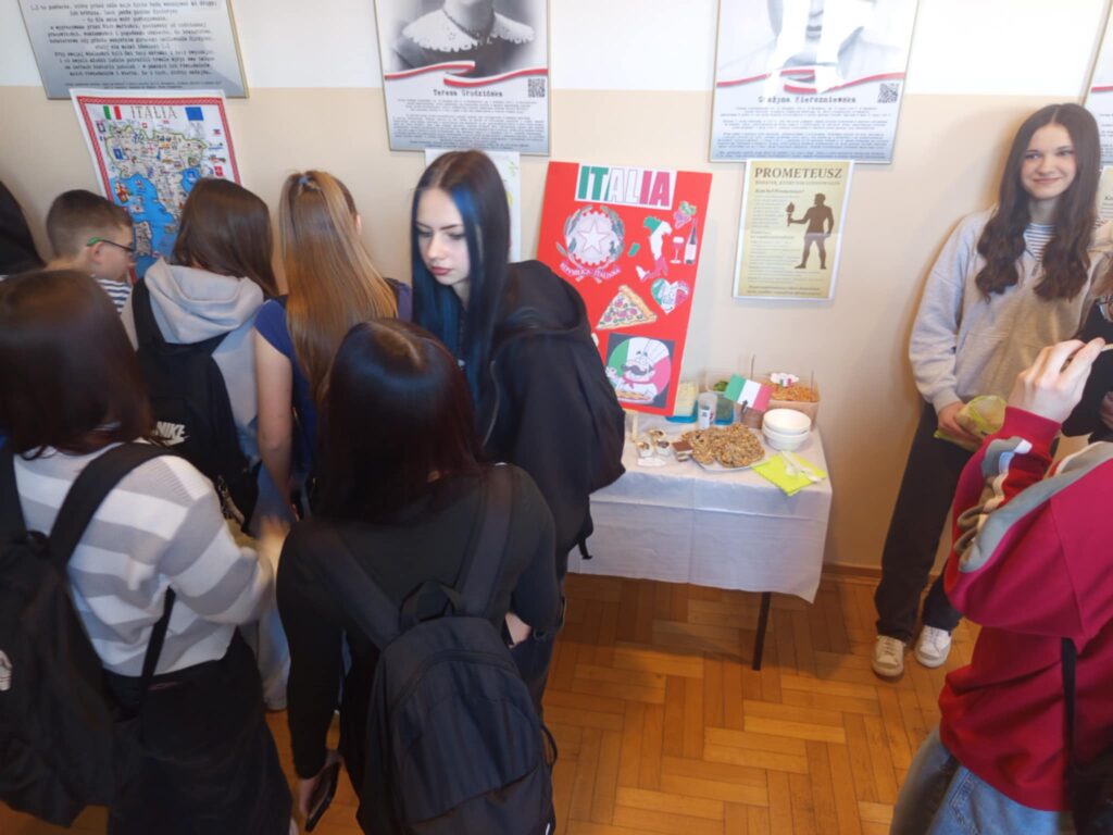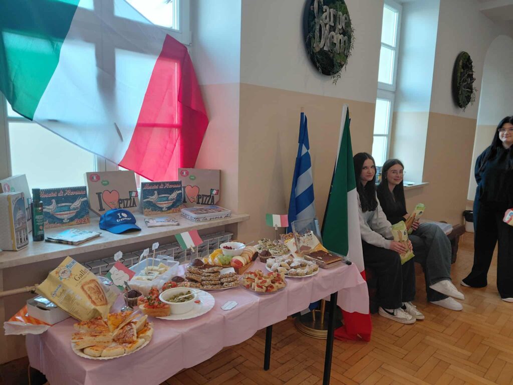 Młodzież przygotowała wyjątkowe specjały kuchni włoskiej, które cieszyły się dużym zainteresowaniem wśród odwiedzających. Na korytarzu można było również zobaczyć wystawę produktów charakterystycznych dla kuchni greckiej i włoskiej, co pozwoliło uczestnikom lepiej poznać smaki i kulturę krajów śródziemnomorskich. Nie zabrakło również wystawy prac uczniowskich inspirowanych tematyką europejską i międzykulturową. Na dolnym korytarzu przygotowano prezentacje poświęcone kulturze i historii regionu Morza Śródziemnego. Uczniowie przedstawili ciekawostki, tradycje oraz najważniejsze wydarzenia związane z tym obszarem, ukazując jego różnorodność i bogactwo. Wydarzenie stanowiło doskonałą okazję do promowania idei mobilności młodzieży, poszerzania wiedzy o innych krajach oraz budowania postawy otwartości na różne kultury — wartości, które od lat są ważnym elementem programu Erasmus+.
