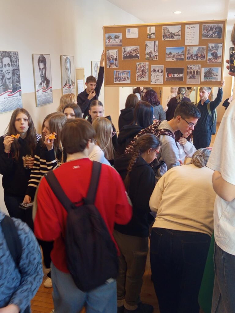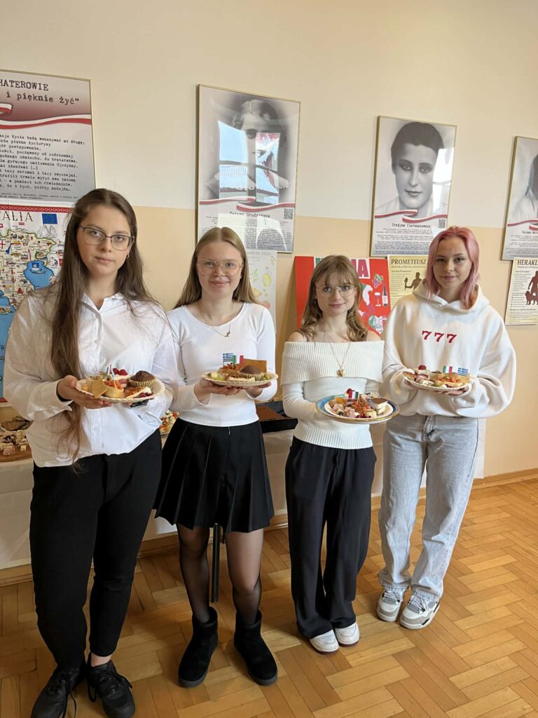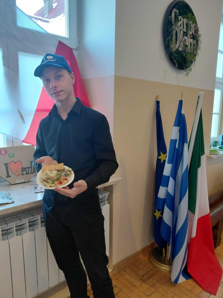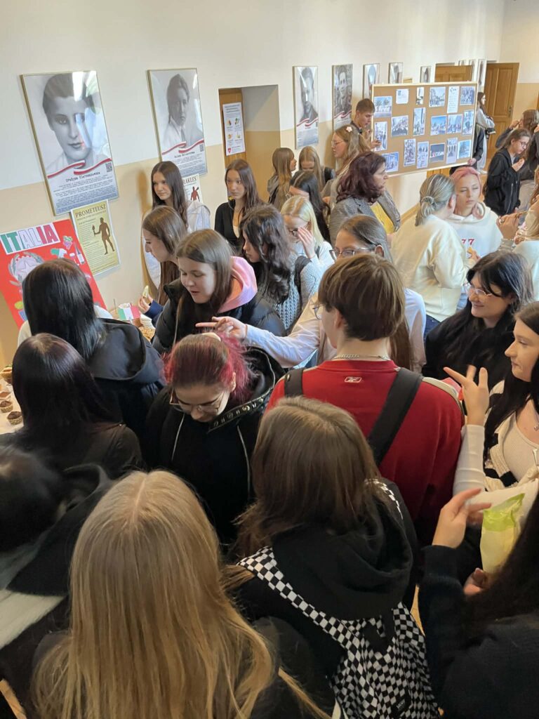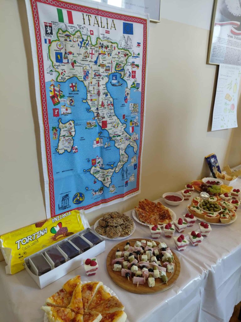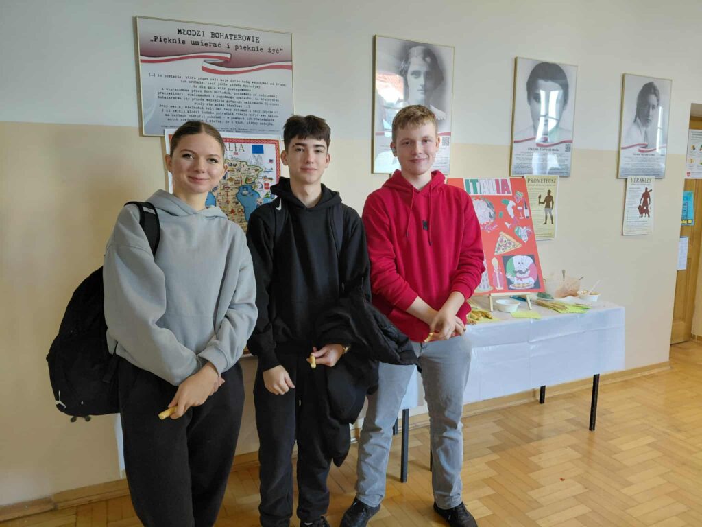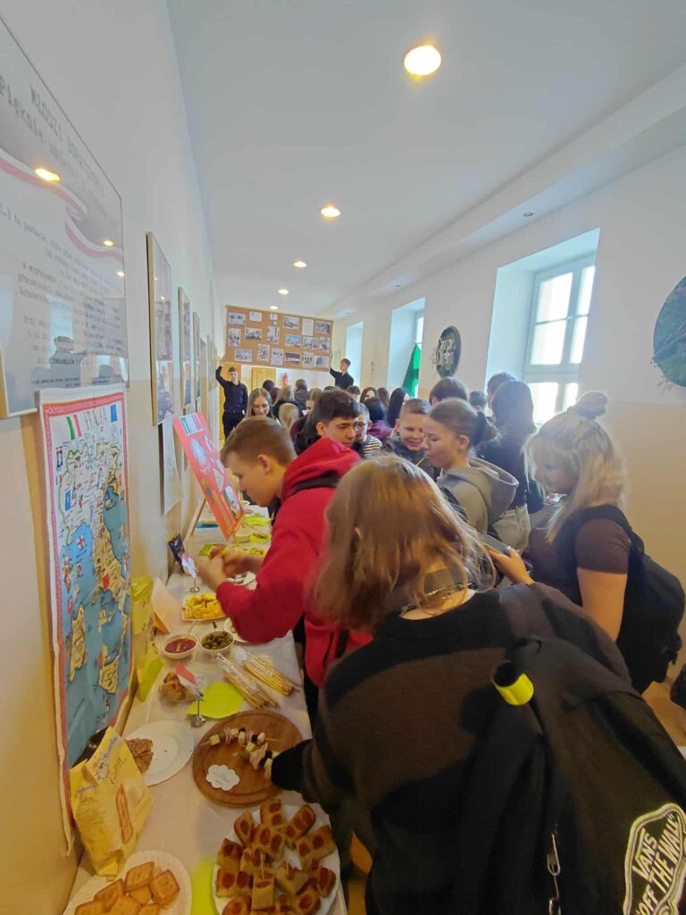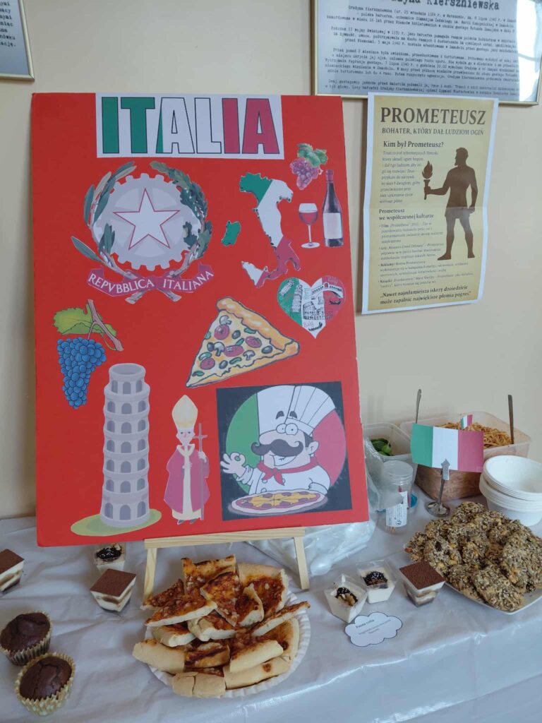 Młodzież przygotowała wyjątkowe specjały kuchni włoskiej, które cieszyły się dużym zainteresowaniem wśród odwiedzających. Na korytarzu można było również zobaczyć wystawę produktów charakterystycznych dla kuchni greckiej i włoskiej, co pozwoliło uczestnikom lepiej poznać smaki i kulturę krajów śródziemnomorskich. Nie zabrakło również wystawy prac uczniowskich inspirowanych tematyką europejską i międzykulturową. Na dolnym korytarzu przygotowano prezentacje poświęcone kulturze i historii regionu Morza Śródziemnego. Uczniowie przedstawili ciekawostki, tradycje oraz najważniejsze wydarzenia związane z tym obszarem, ukazując jego różnorodność i bogactwo. Wydarzenie stanowiło doskonałą okazję do promowania idei mobilności młodzieży, poszerzania wiedzy o innych krajach oraz budowania postawy otwartości na różne kultury — wartości, które od lat są ważnym elementem programu Erasmus+.