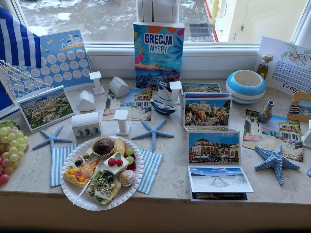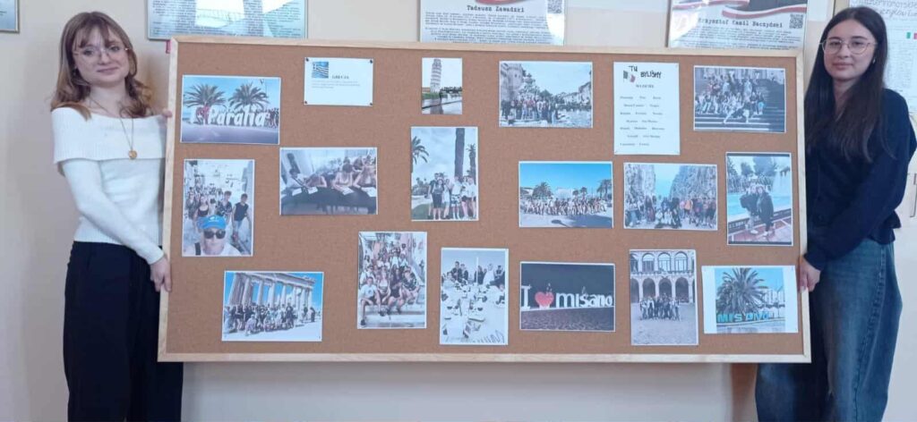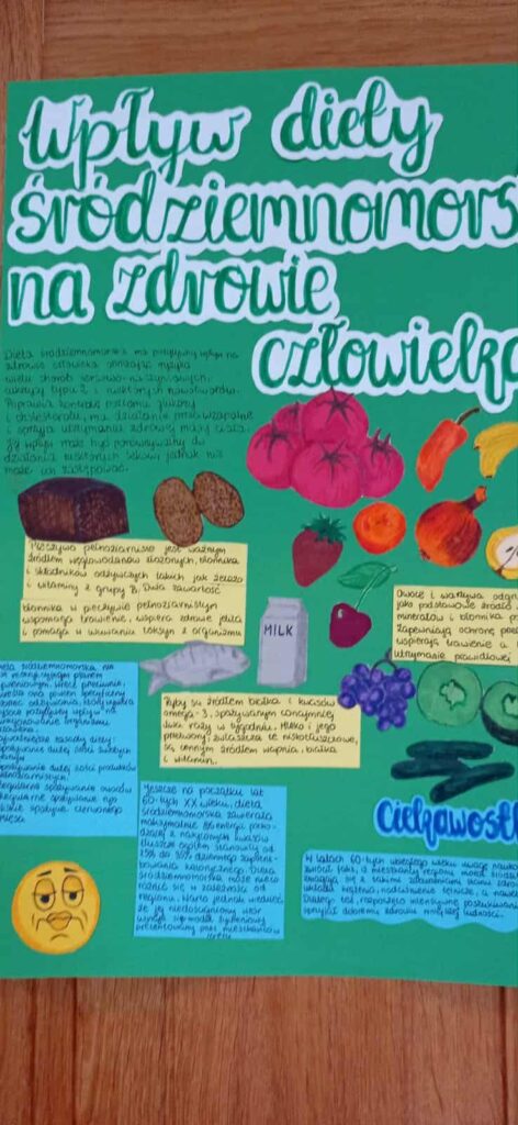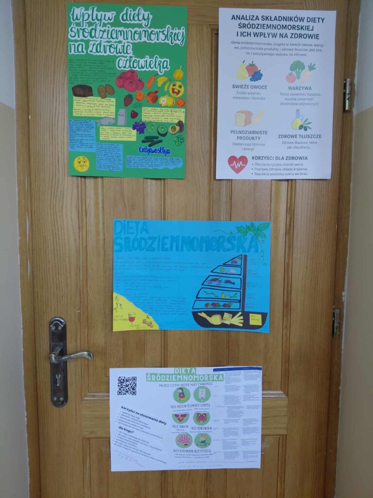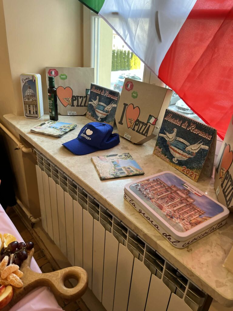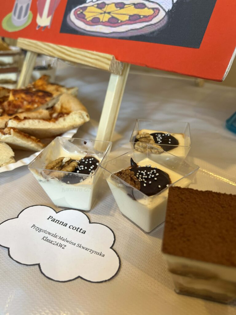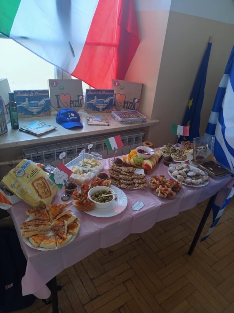 Młodzież przygotowała wyjątkowe specjały kuchni włoskiej, które cieszyły się dużym zainteresowaniem wśród odwiedzających. Na korytarzu można było również zobaczyć wystawę produktów charakterystycznych dla kuchni greckiej i włoskiej, co pozwoliło uczestnikom lepiej poznać smaki i kulturę krajów śródziemnomorskich. Nie zabrakło również wystawy prac uczniowskich inspirowanych tematyką europejską i międzykulturową. Na dolnym korytarzu przygotowano prezentacje poświęcone kulturze i historii regionu Morza Śródziemnego. Uczniowie przedstawili ciekawostki, tradycje oraz najważniejsze wydarzenia związane z tym obszarem, ukazując jego różnorodność i bogactwo. Wydarzenie stanowiło doskonałą okazję do promowania idei mobilności młodzieży, poszerzania wiedzy o innych krajach oraz budowania postawy otwartości na różne kultury — wartości, które od lat są ważnym elementem programu Erasmus+.