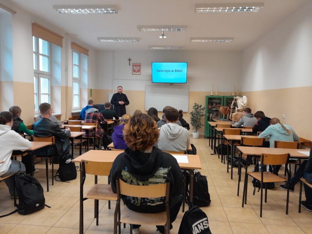 Z tej okazji uczniowie klasy 1TRW (technik weterynarii) wzięli udział w II edycji szkolnego konkursu pt. „Zwierzęta w Biblii”. Nie wszyscy wiedzą, że Biblię można traktować także jako atlas zoologiczny, który dostarcza informacji o ponad 100 gatunkach zwierząt. Na podstawie tekstu Starego i nowego Testamentu można wysunąć wiele wniosków na temat tego jakie zwierzęta występowały wówczas w tym rejonie świata, które występują nadal, a które wymarły. Są w niej także zalecenia dotyczące spożywania mięsa zwierzęcego (najlepiej zwierzęta parzystokopytne i przeżuwające) ze względu na skutki zdrowotne dla człowieka. Zwierzęta to także symbole np. lew – symbol władzy i siły, gołąb – symbol pokoju, Ducha Świętego, baranek – symbol niewinności, ofiary Jezusa Chrystusa oraz wiele innych. Dla uczniów weterynarii zgłębianie Pisma Świętego to dodatkowe źródło fachowej wiedzy.