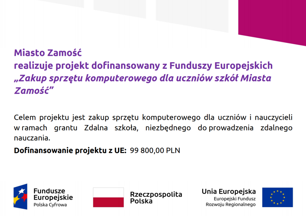 PROJEKTY WSPÓŁFINANSOWANE ZE ŚRODKÓW UNII EUROPEJSKIEJ W ZSP NR 5 W ZAMOŚCIU