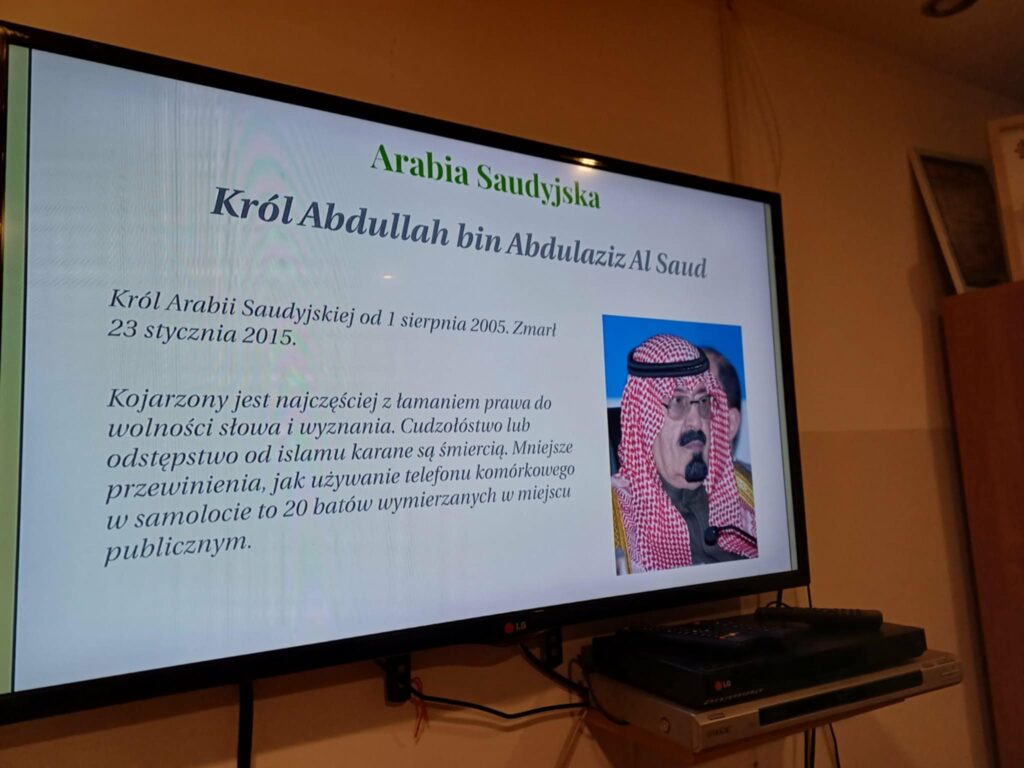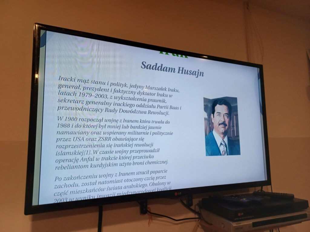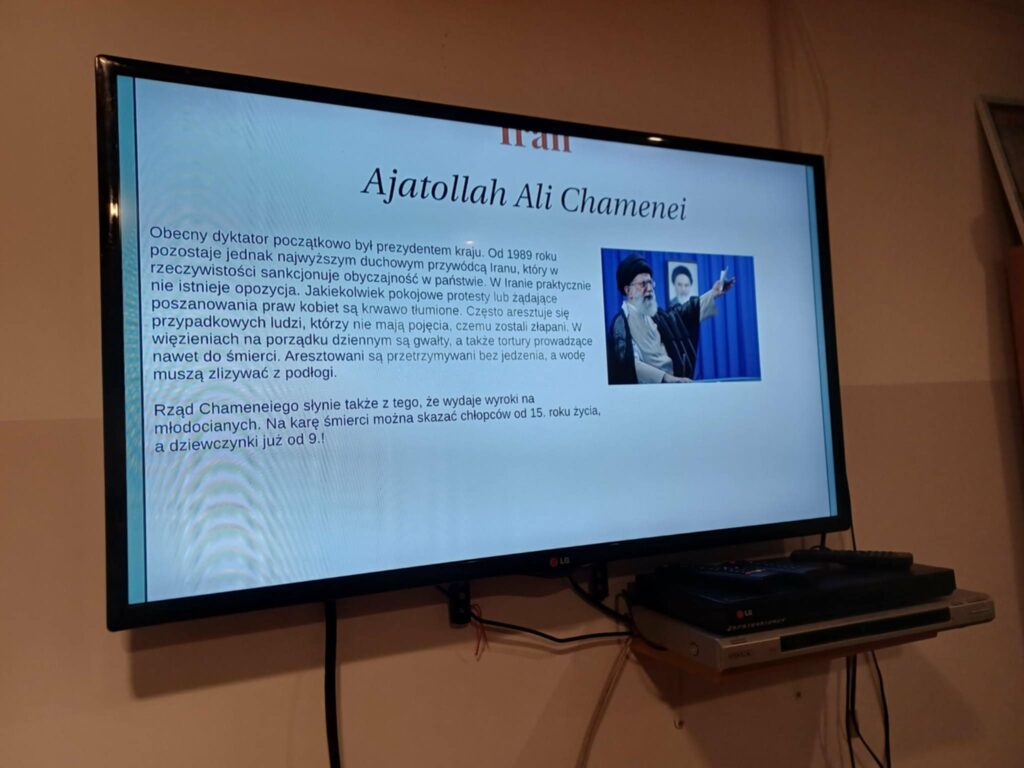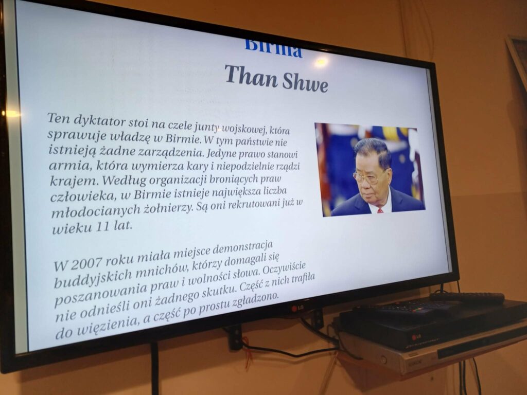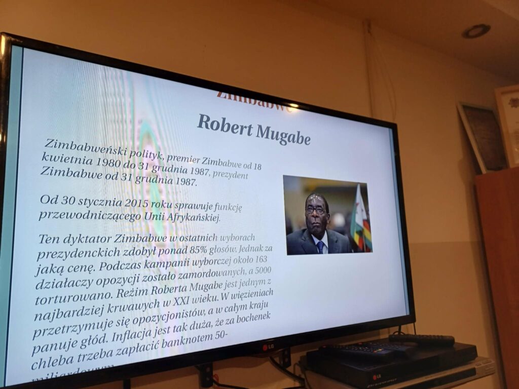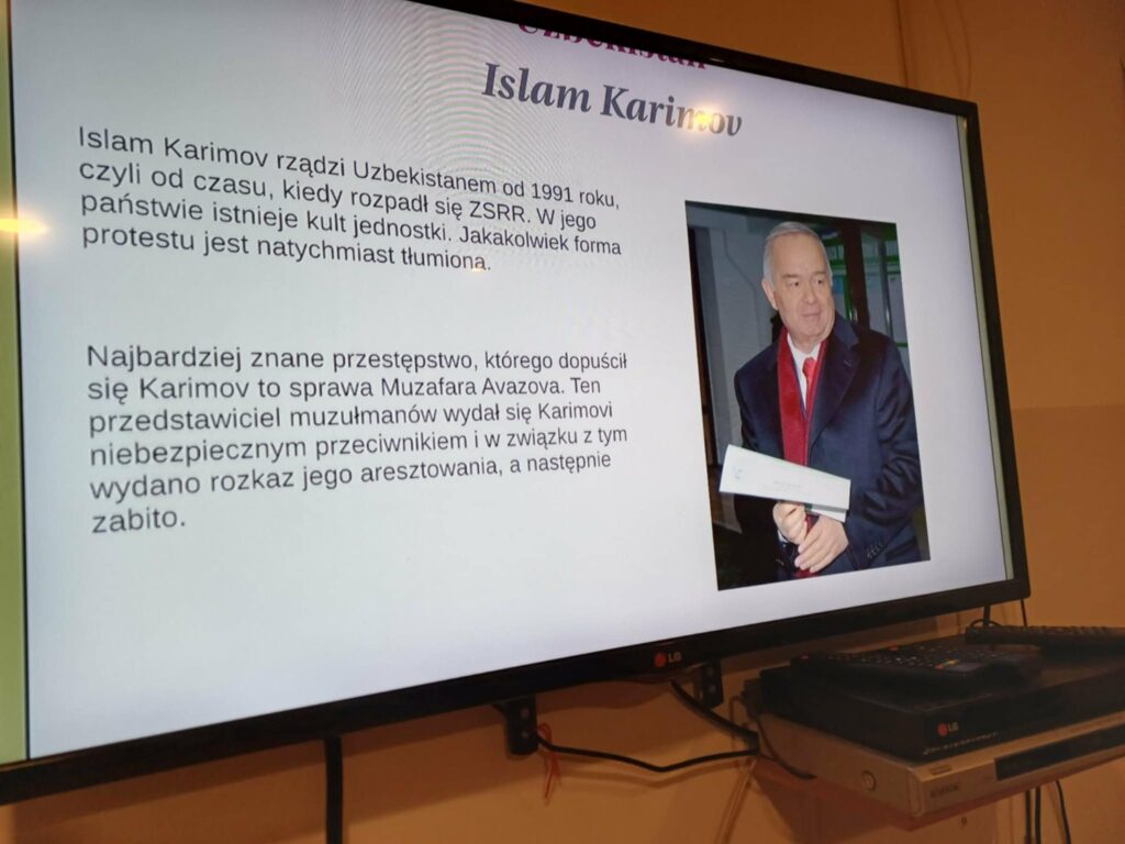 Druga część zajęć została poświęcona dyktatorom XXI wieku. Uczestnicy mogli dowiedzieć się więcej o współczesnych autorytarnych przywódcach rządzących m.in. w Rosji, Białorusi, Sudanie, Korei Północnej, Zimbabwe czy Uzbekistanie. Zajęcia zostały uzupełnione projekcją filmu przybliżającego sylwetki tych przywódców i realia życia w państwach rządzonych w sposób niedemokratyczny. Dziękujemy p. Agnieszce Piróg za wykonanie dokumentacji fotograficznej ze spotkania.