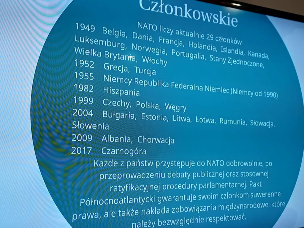 Podczas spotkania omówiono historię powstania NATO, jego strukturę, cele oraz najważniejsze działania. Wychowankowie przypomnieli sobie również, które państwa należą do sojuszu oraz jakie znaczenie dla bezpieczeństwa kraju ma członkostwo w tej organizacji.