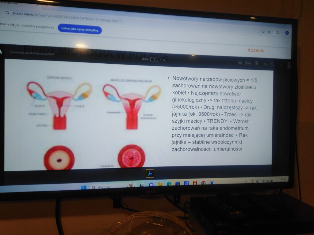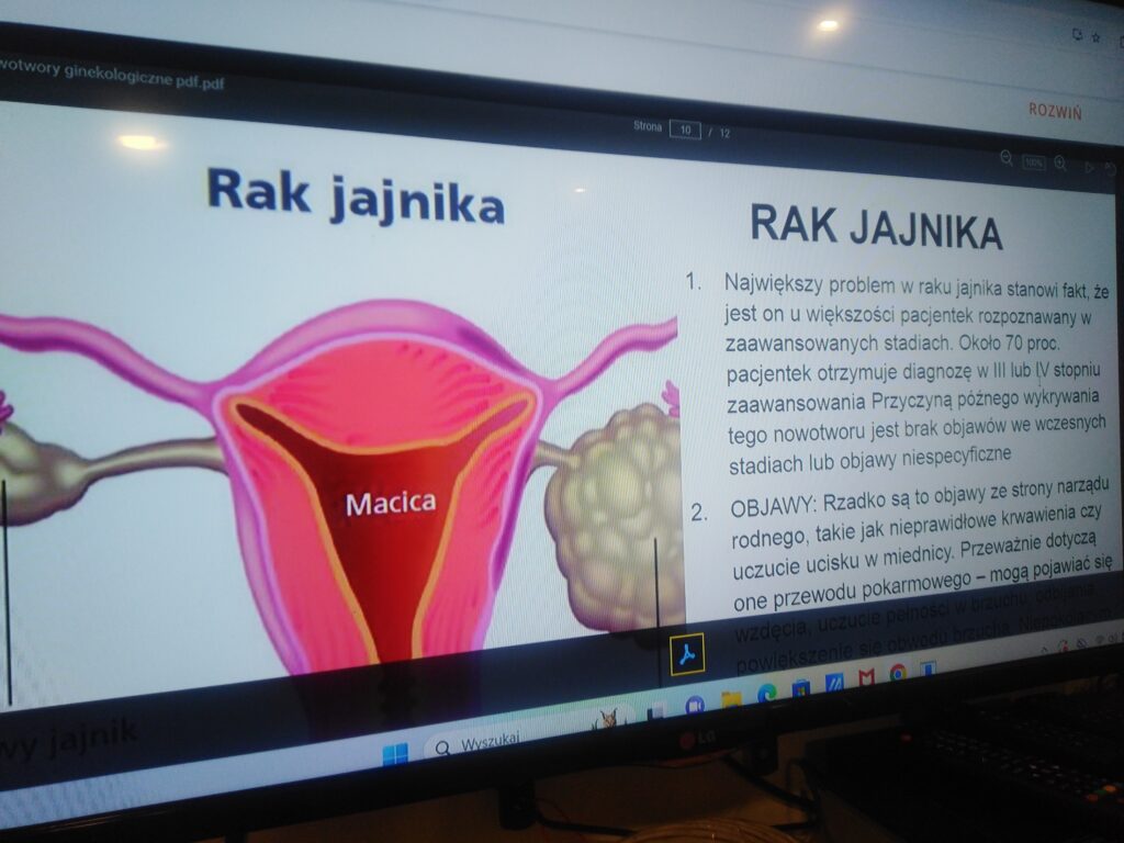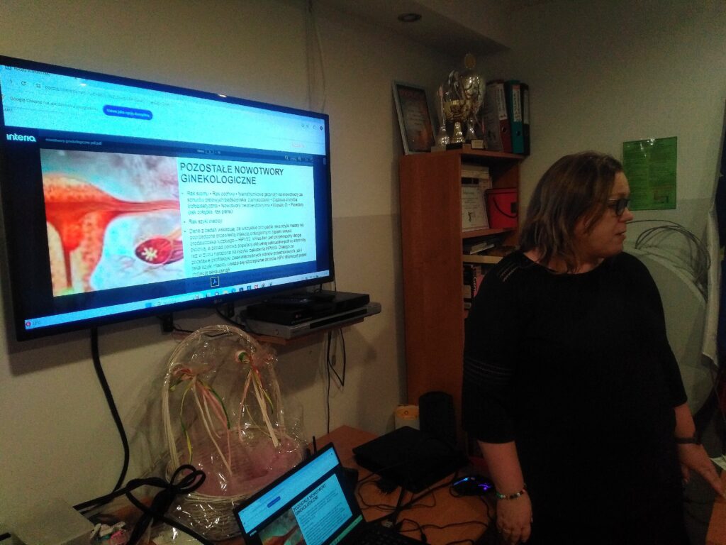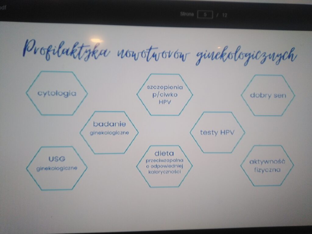 Omówiła objawy, profilaktykę i sposoby leczenia najczęściej występujących nowotworów ginekologicznych: raka szyjki macicy, raka trzonu macicy oraz raka jajnika. Podkreśliła jak ważne są regularne wizyty u ginekologa, badania cytologiczne, usg, testy w kierunku HPV, aktywność fizyczna, dieta oraz dobry sen.