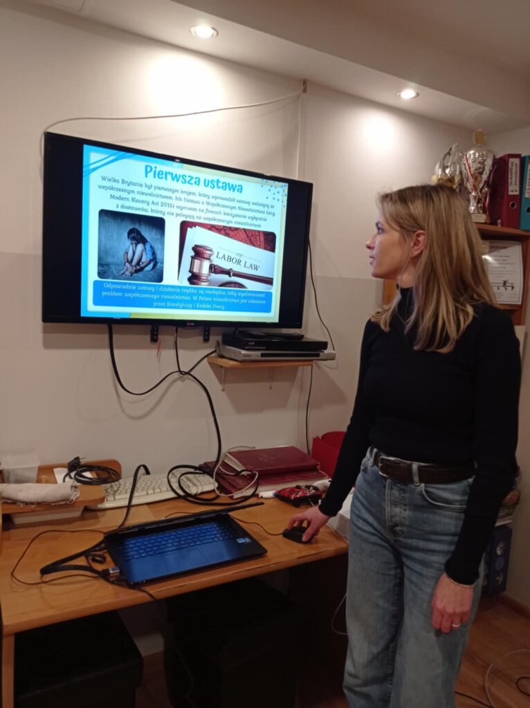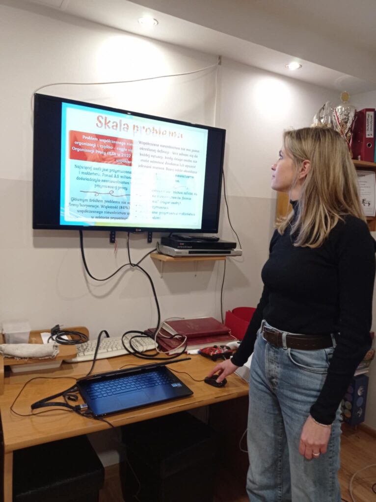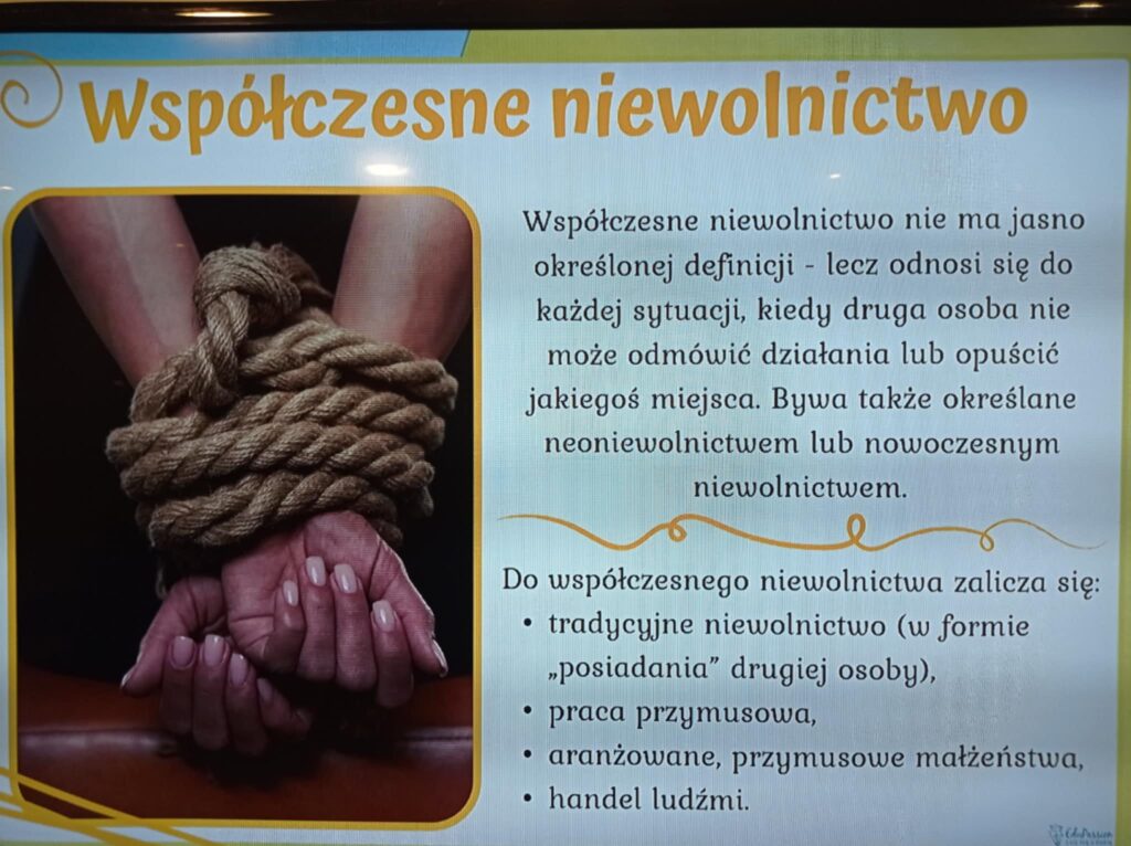 Celem spotkania było uświadomienie wychowankom skali problemu współczesnego niewolnictwa, które przybiera różne formy, od pracy przymusowej po handel ludźmi. Pani Zuzanna delikatnie wprowadziła temat, omawiając zarówno historyczne, jak i współczesne przypadki niewolnictwa, a także sposoby, w jakie społeczeństwo może reagować na takie zjawiska.
