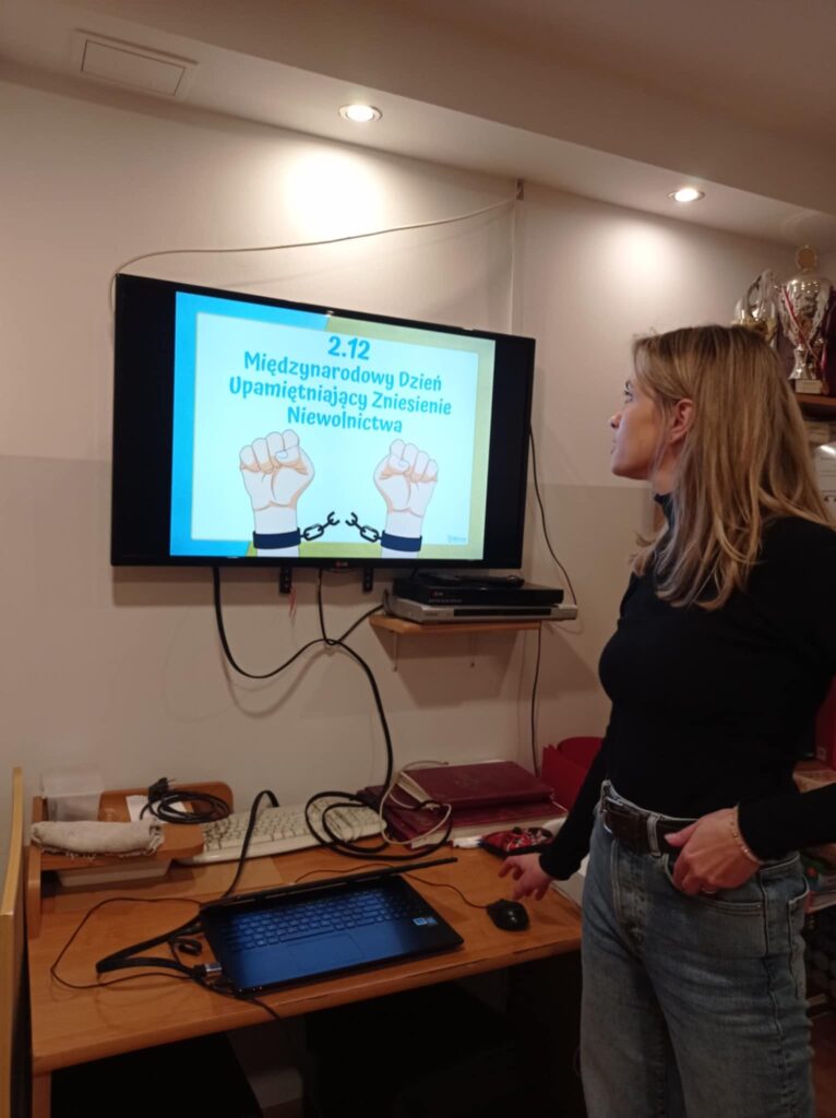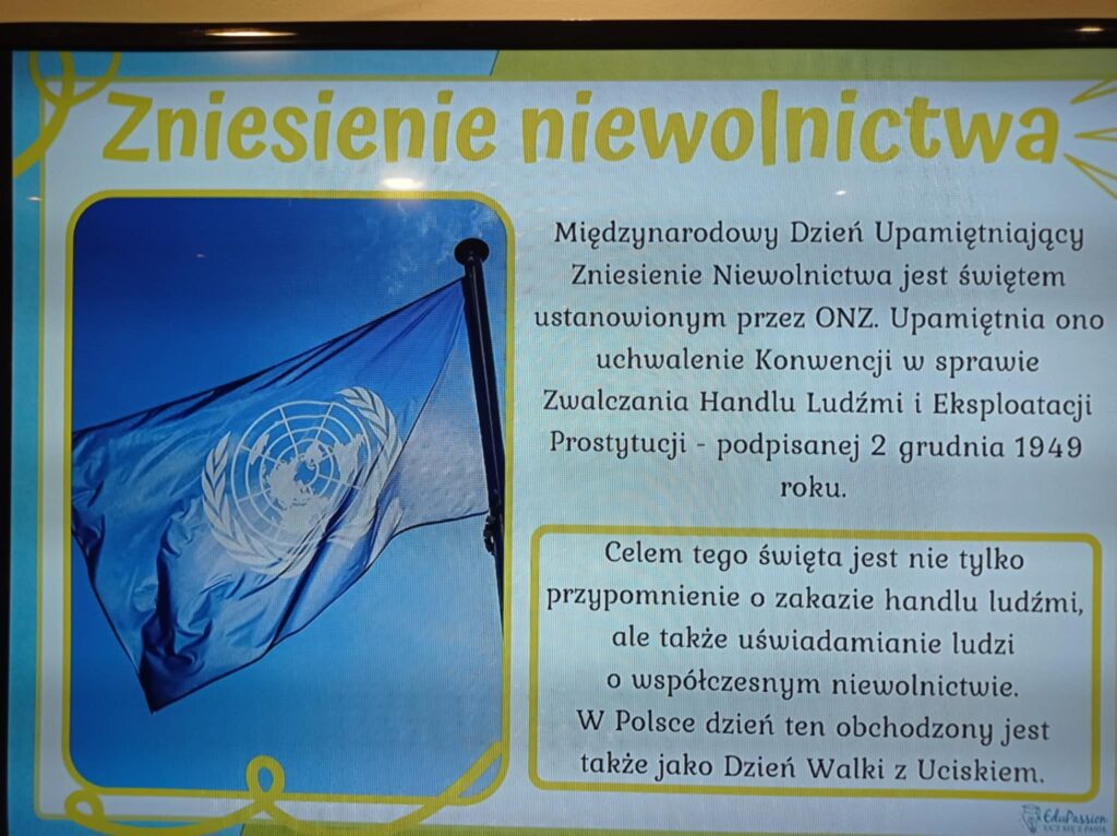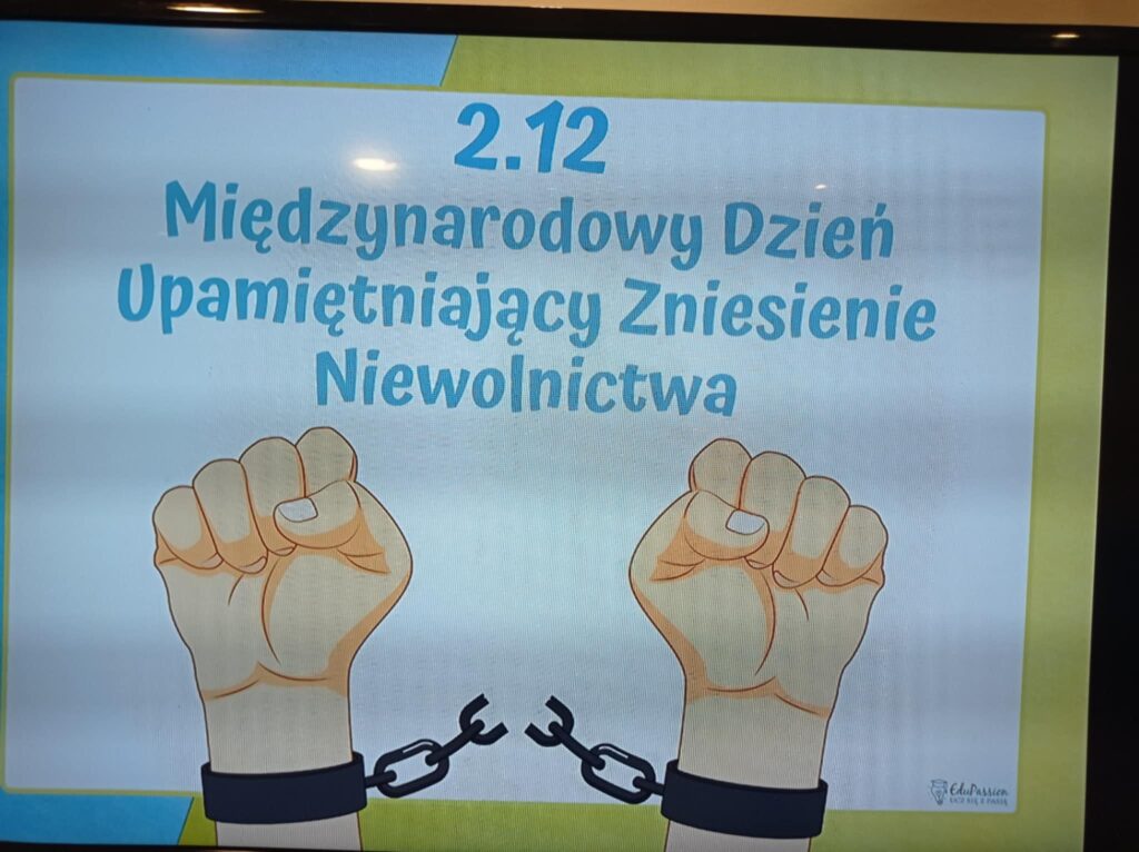 Dnia 2 grudnia 2024 roku, wychowawczyni Zuzanna Majdan przeprowadziła zajęcia w internacie, poświęcone obchodom Światowego Dnia Ucisku i Niewolnictwa.