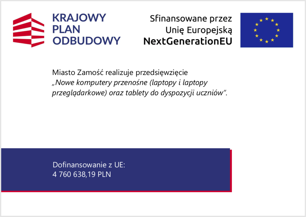 Miasto Zamość zawarło umowę nieodpłatnego przekazania sprzętu nr C15G/11495/2025 ze Skarbem Państwa – Ministrem Cyfryzacji, w imieniu którego działa Naukowa i Akademicka Sieć Komputerowa – Państwowy Instytut Badawczy (NASK-PIB), na mocy której szkoły dla których organem prowadzącym jest Miasto Zamość, otrzymają nieodpłatnie sprzęt komputerowy w związku z realizacją zadania finansowanego ze środków Krajowego Planu Odbudowy i Zwiększania Odporności (KPO).