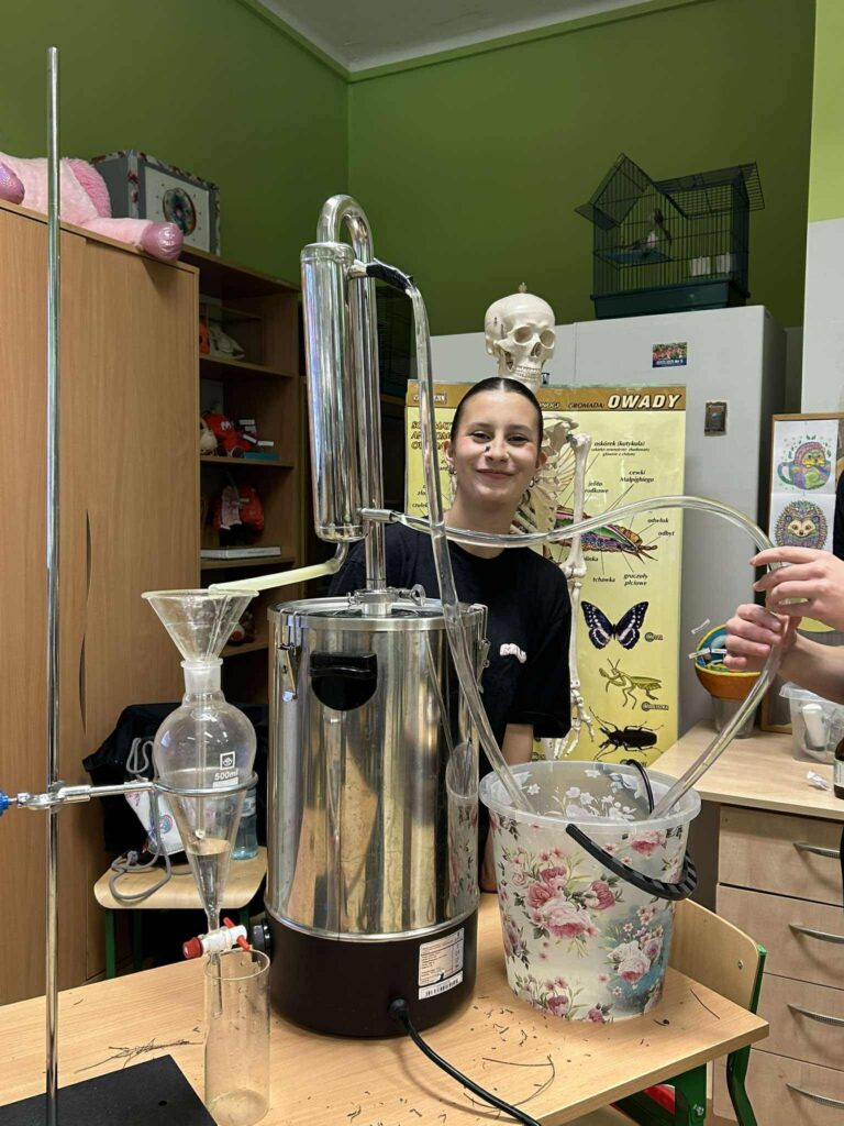 Uczennice z klasy 4TAR Kamila, Amelia i Emilia z p. Olgą Gontarz poprowadziły pokaz destylacji olejku eterycznego z lawendy, a młodsi koledzy mieli okazję podziwiać rośliny olejkodajne z naszego szkolnego ogrodu dydaktycznego podczas spaceru botanicznego.