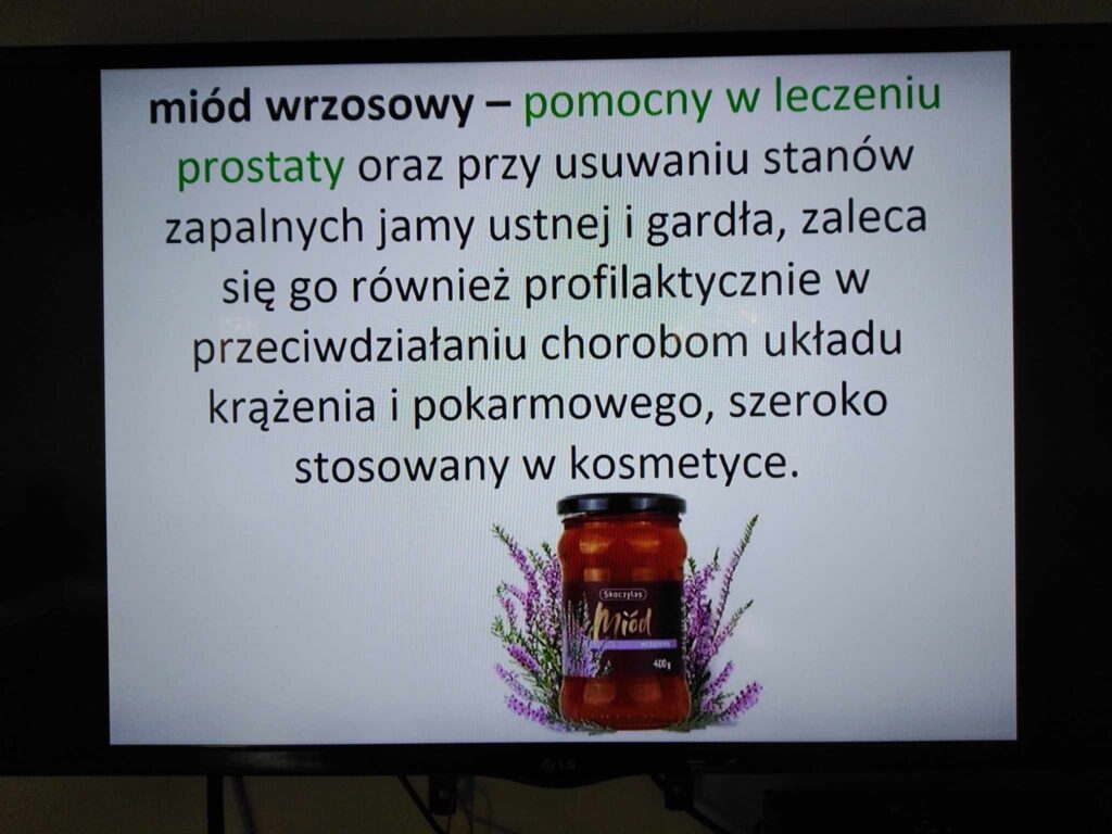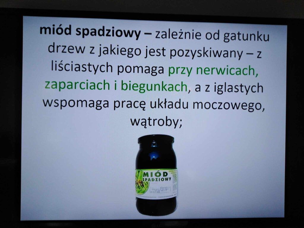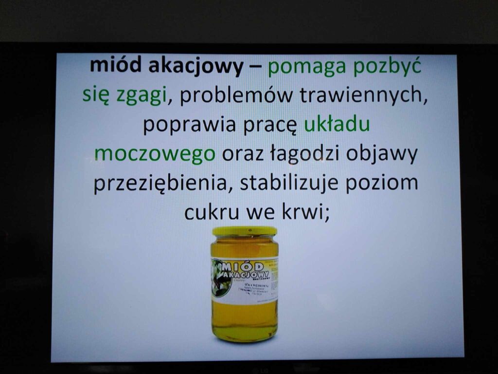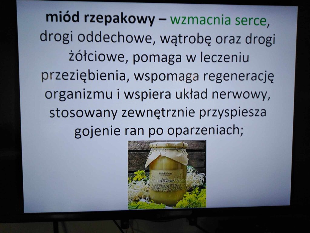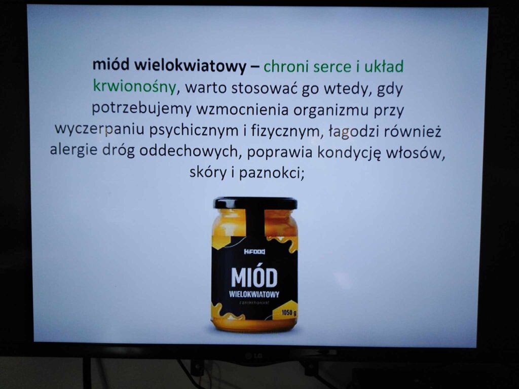 Uzupełnieniem spotkania była także prezentacja i prelekcja naszej absolwentki z klasy technik żywienia i usług gastronomicznych Aleksandry Rój nt.: „Pozytywnego stosowania miodu w pożywieniu”. Ola podała młodzieży ciekawe przepisy, poinformowała o składnikach odżywczych zawartych w miodzie (cukrach, witaminach, minerałach) oraz działaniu miodu na organizm człowieka (antybakteryjnym, przeciwzapalnym, wspomagającym układ odpornościowy).Ciekawym zakończeniem spotkania były przykłady dań i napojów, w których miód może być zastosowany. Praktykantka podzieliła się przepisami na potrawy z użyciem miodu (np. owsianka z miodem, sałatka owocowa z miodowym dressingiem, itd).