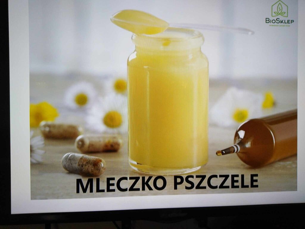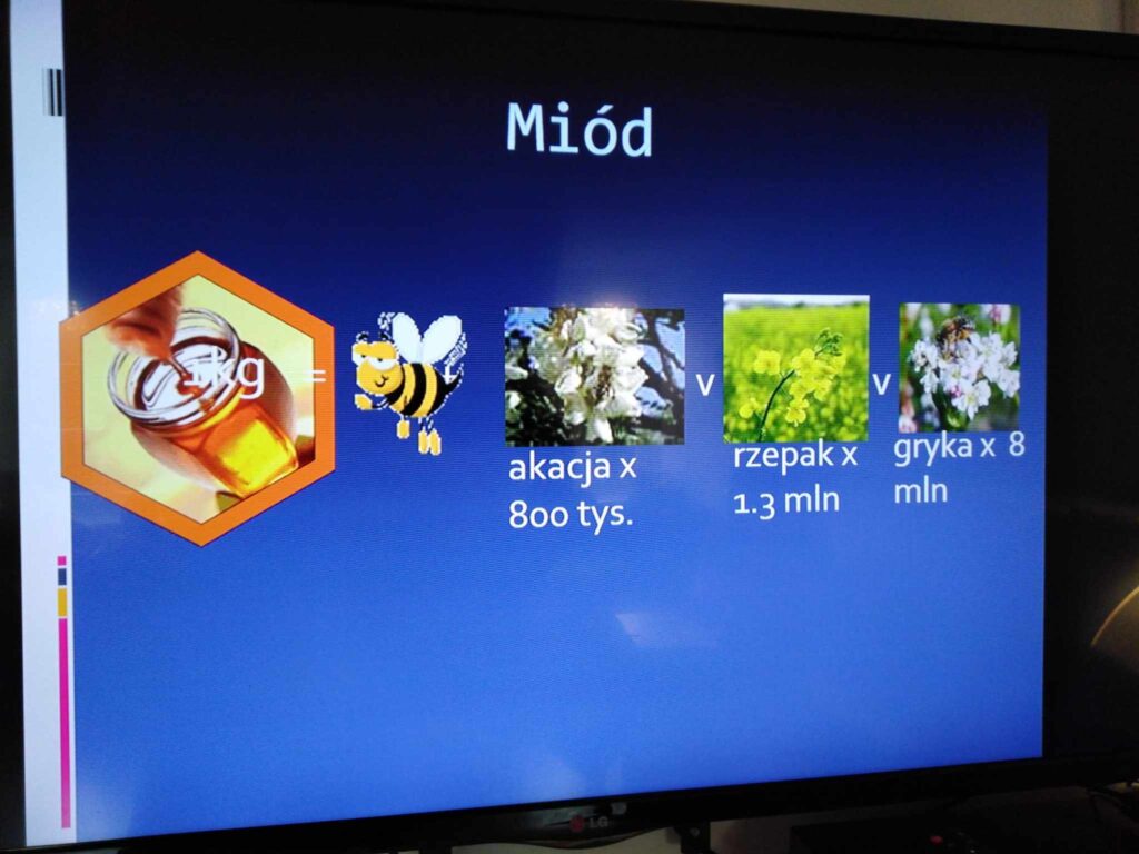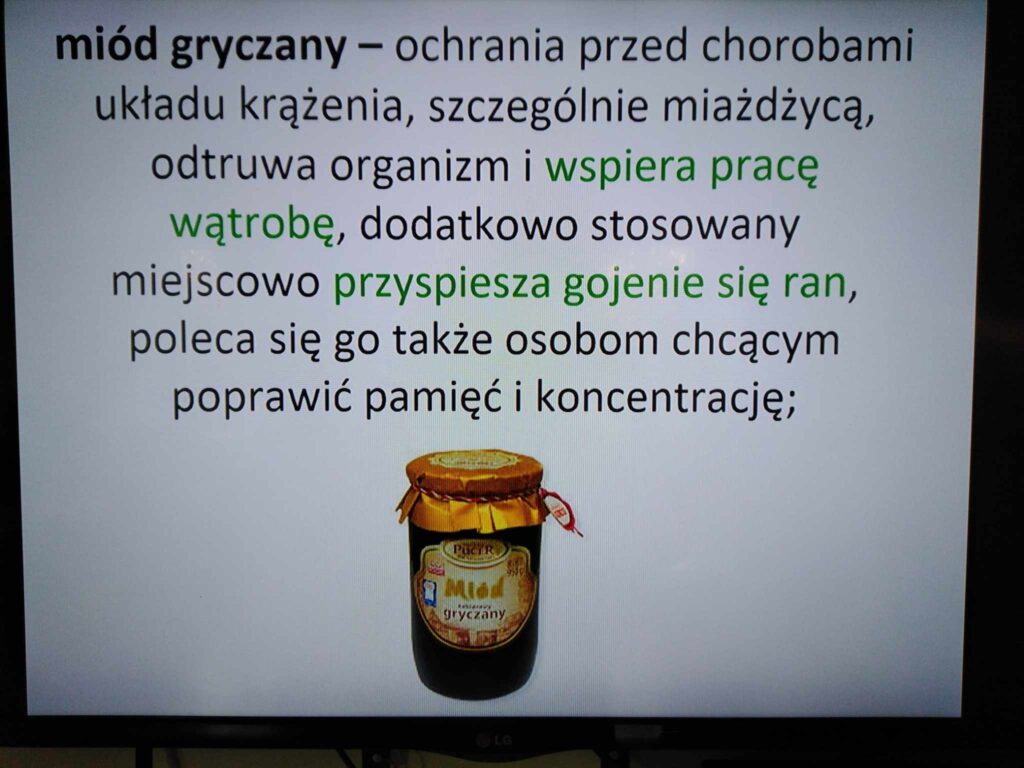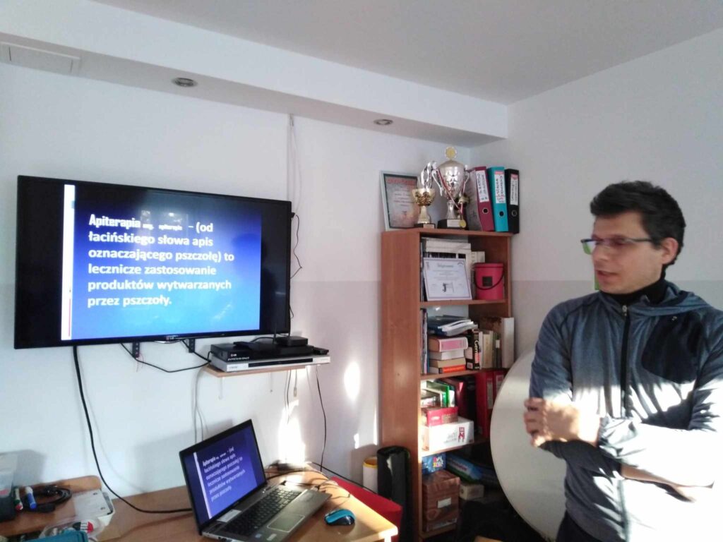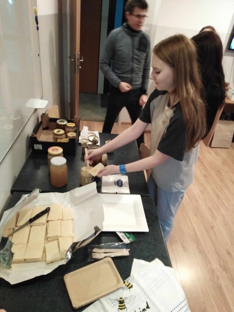 Uzupełnieniem spotkania była także prezentacja i prelekcja naszej absolwentki z klasy technik żywienia i usług gastronomicznych Aleksandry Rój nt.: „Pozytywnego stosowania miodu w pożywieniu”. Ola podała młodzieży ciekawe przepisy, poinformowała o składnikach odżywczych zawartych w miodzie (cukrach, witaminach, minerałach) oraz działaniu miodu na organizm człowieka (antybakteryjnym, przeciwzapalnym, wspomagającym układ odpornościowy).Ciekawym zakończeniem spotkania były przykłady dań i napojów, w których miód może być zastosowany. Praktykantka podzieliła się przepisami na potrawy z użyciem miodu (np. owsianka z miodem, sałatka owocowa z miodowym dressingiem, itd).