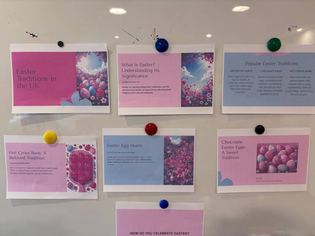 Uczniowie dowiedzieli się także o tradycyjnych potrawach, takich jak „hot cross buns” – słodkie bułeczki z charakterystycznym krzyżem na wierzchu, spożywane w Wielki Piątek. Omówiono również znaczenie Niedzieli Wielkanocnej oraz sposoby jej celebrowania w brytyjskich domach.