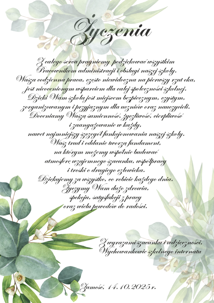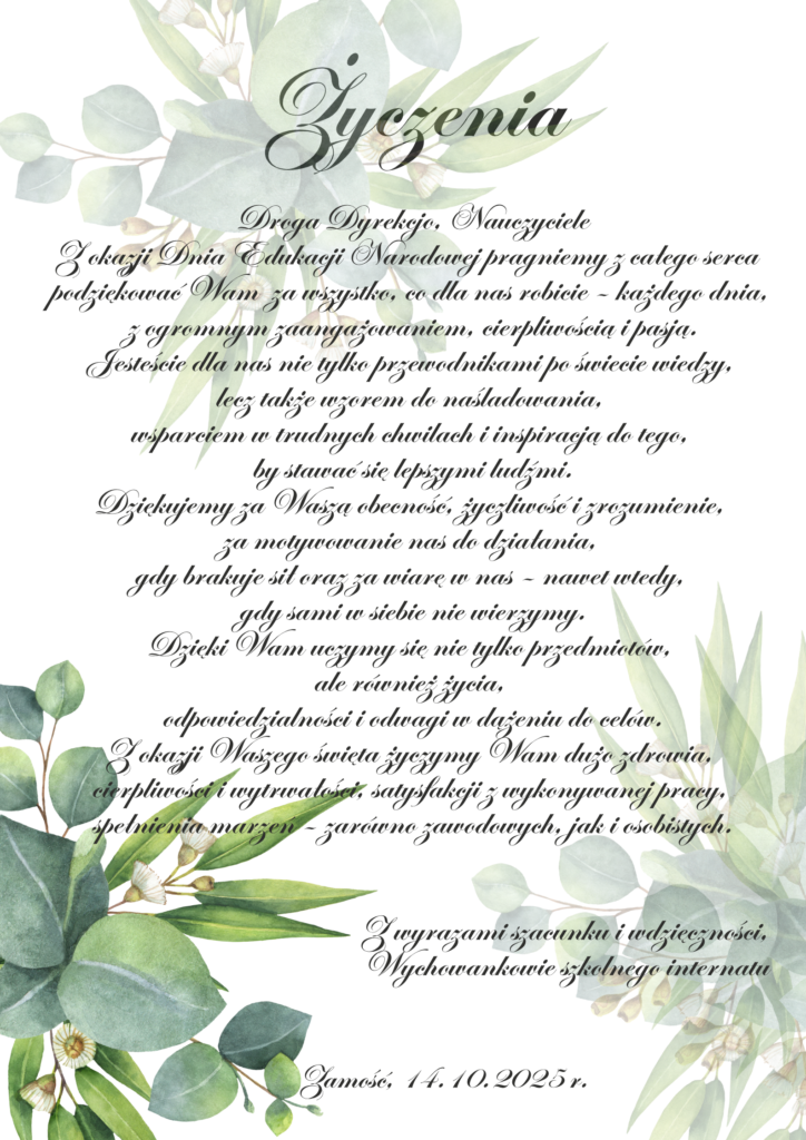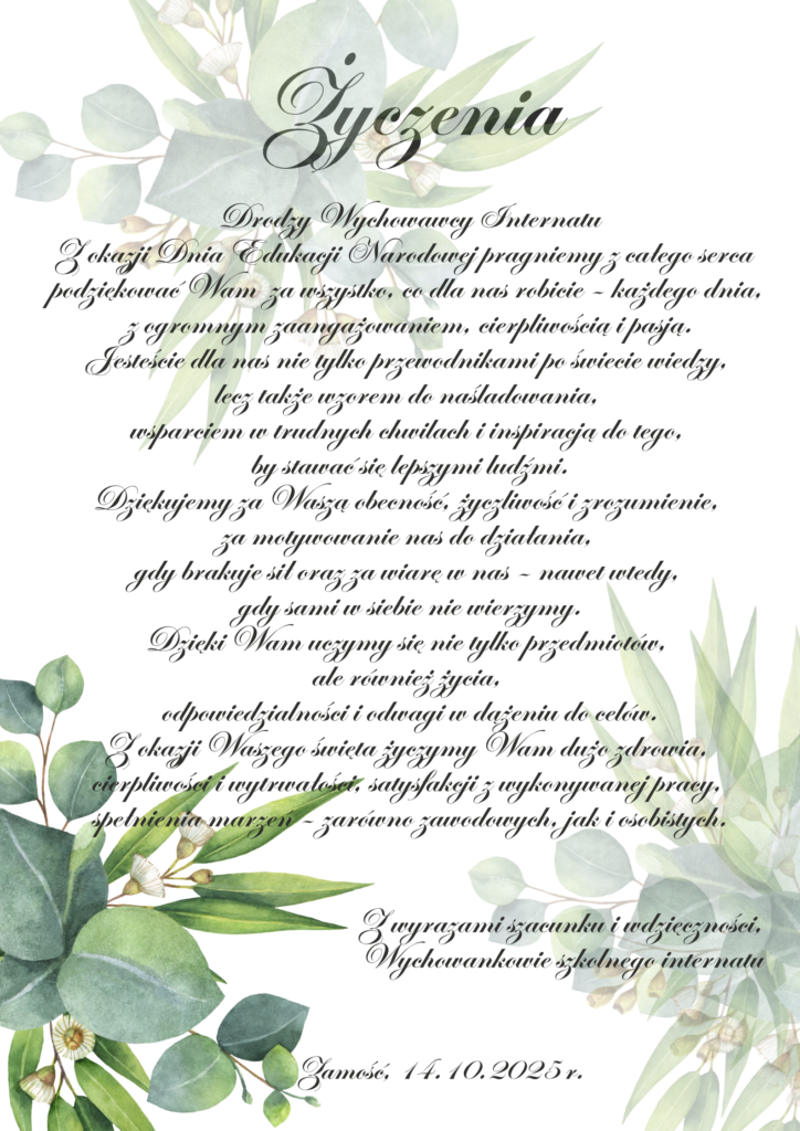 Z okazji Dnia Edukacji Narodowej w dniu 15 października 2025 r. wychowankowie szkolnego internatu przygotowali serdeczne życzenia dla Dyrekcji, Nauczycieli, Wychowawców internatu oraz Pracowników administracji i obsługi. W ciepłych słowach wyrazili wdzięczność za codzienny trud, zaangażowanie oraz troskę o rozwój i wychowanie młodzieży.